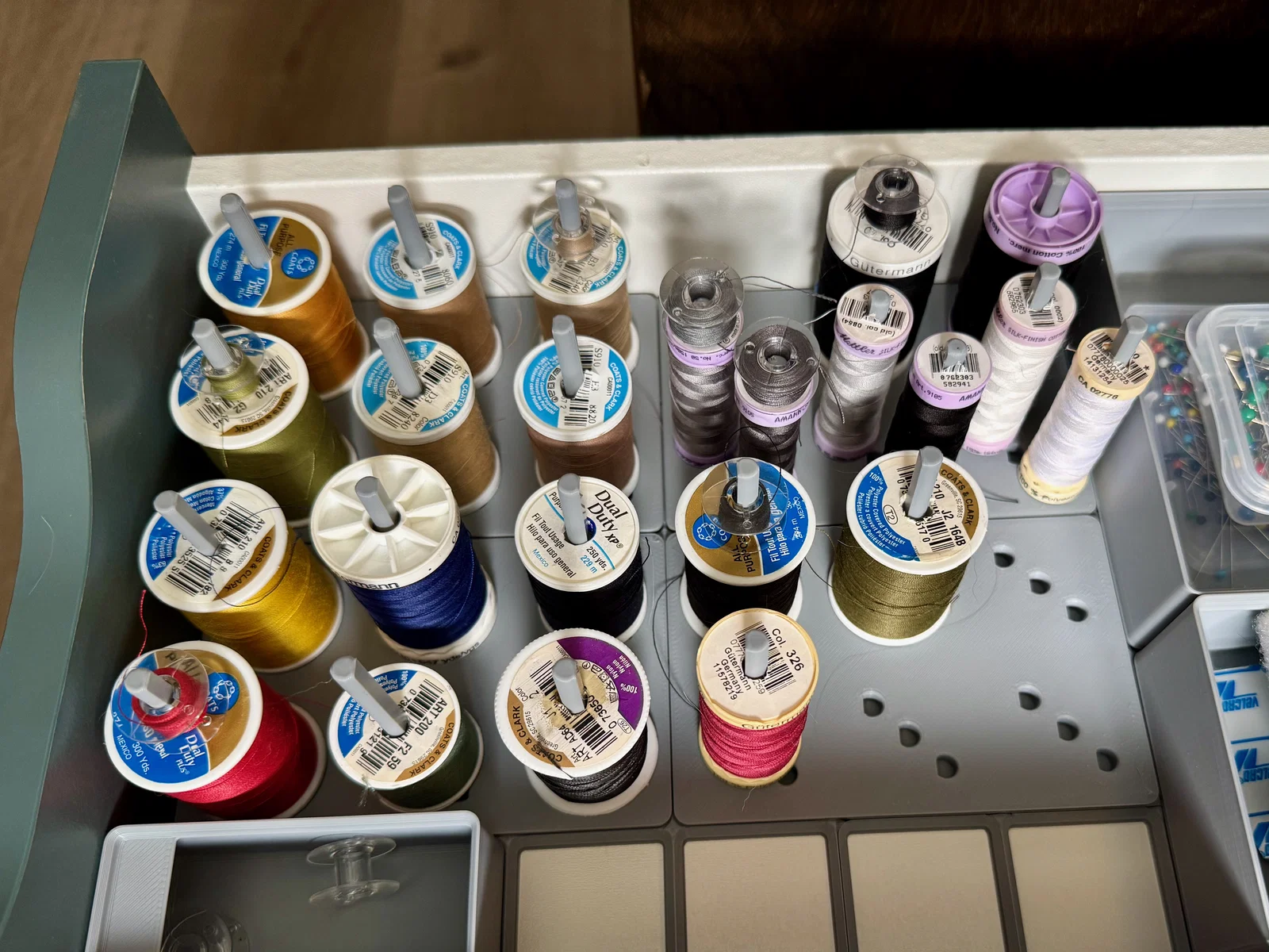 Khay giữ cuộn chỉ và suốt máy may theo hệ Gridfinity, dạng bin 2x3 cao 1u với 18 vị trí cắm chốt. Cho phép mix & match 6 cuộn lớn, 12 cuộn nhỏ hoặc kết hợp; có chốt cao để kèm suốt và có thể scale trong slicer.