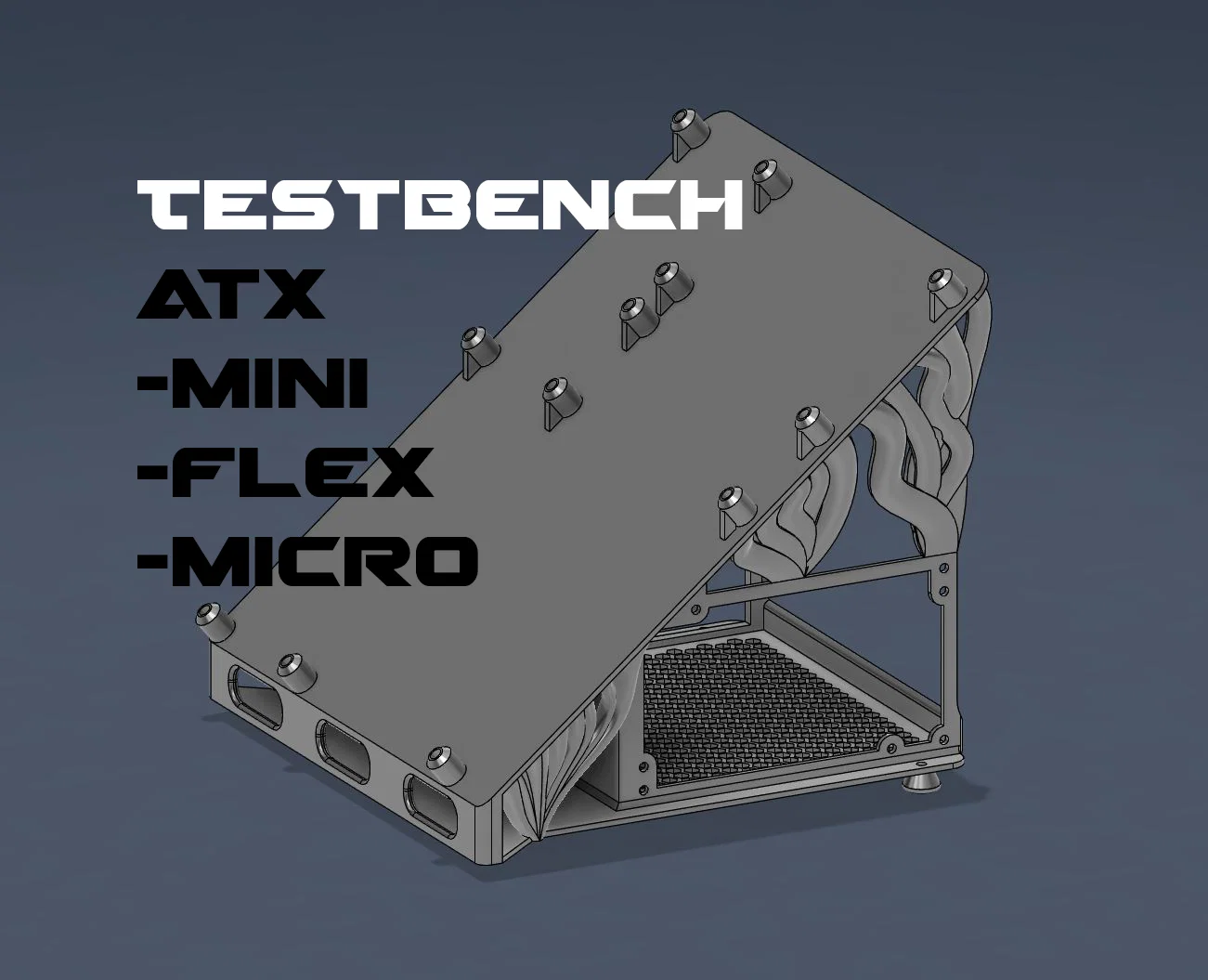 Testbench in 3D giúp bạn dễ thao tác, thay và chẩn đoán phần cứng PC mà không cần case. Có khe ổ cứng hot-swappable và standoff cho ATX, Micro-ATX, Flex-ATX, Mini-ATX. Cần M3 heat-set inserts.