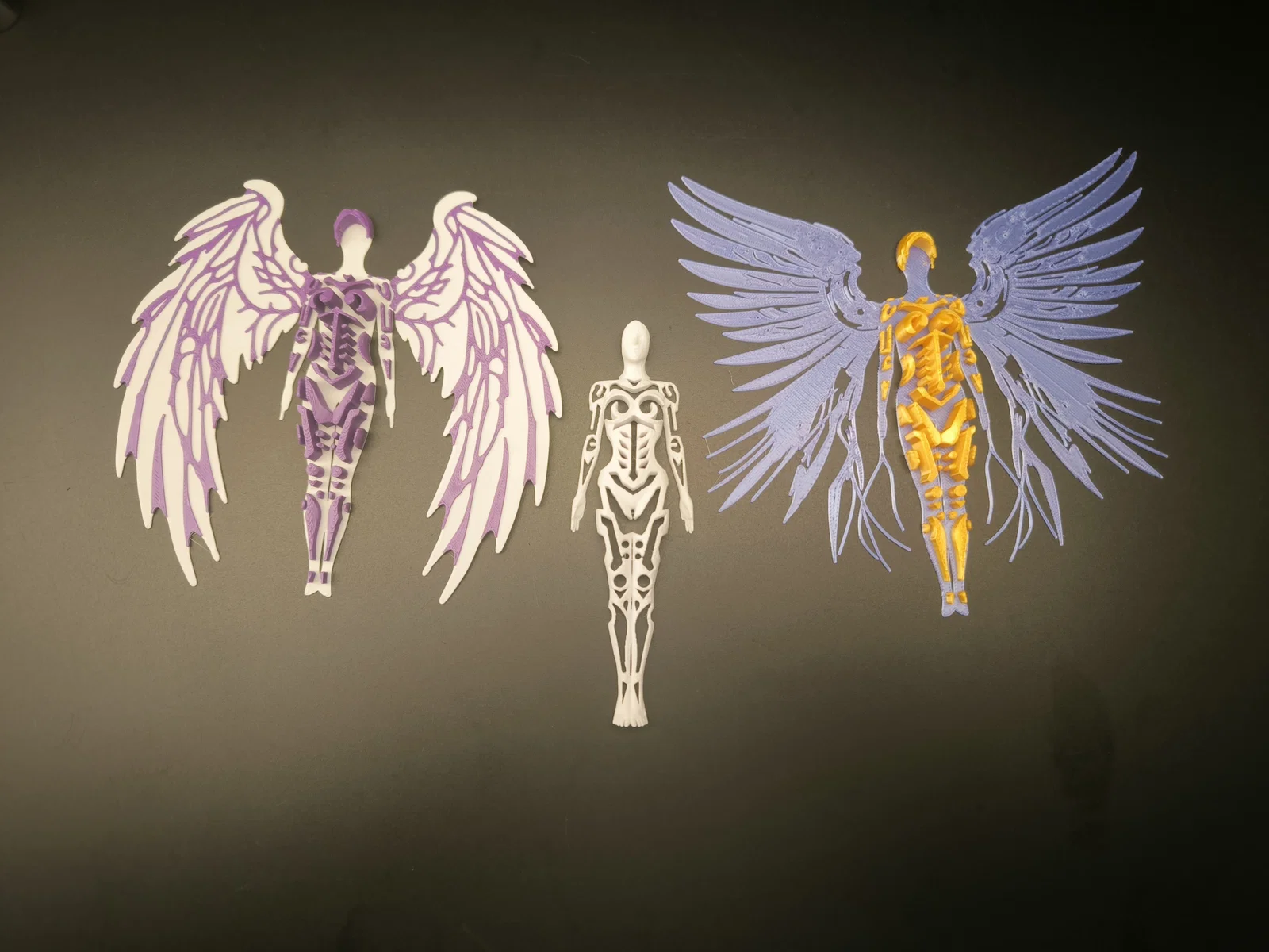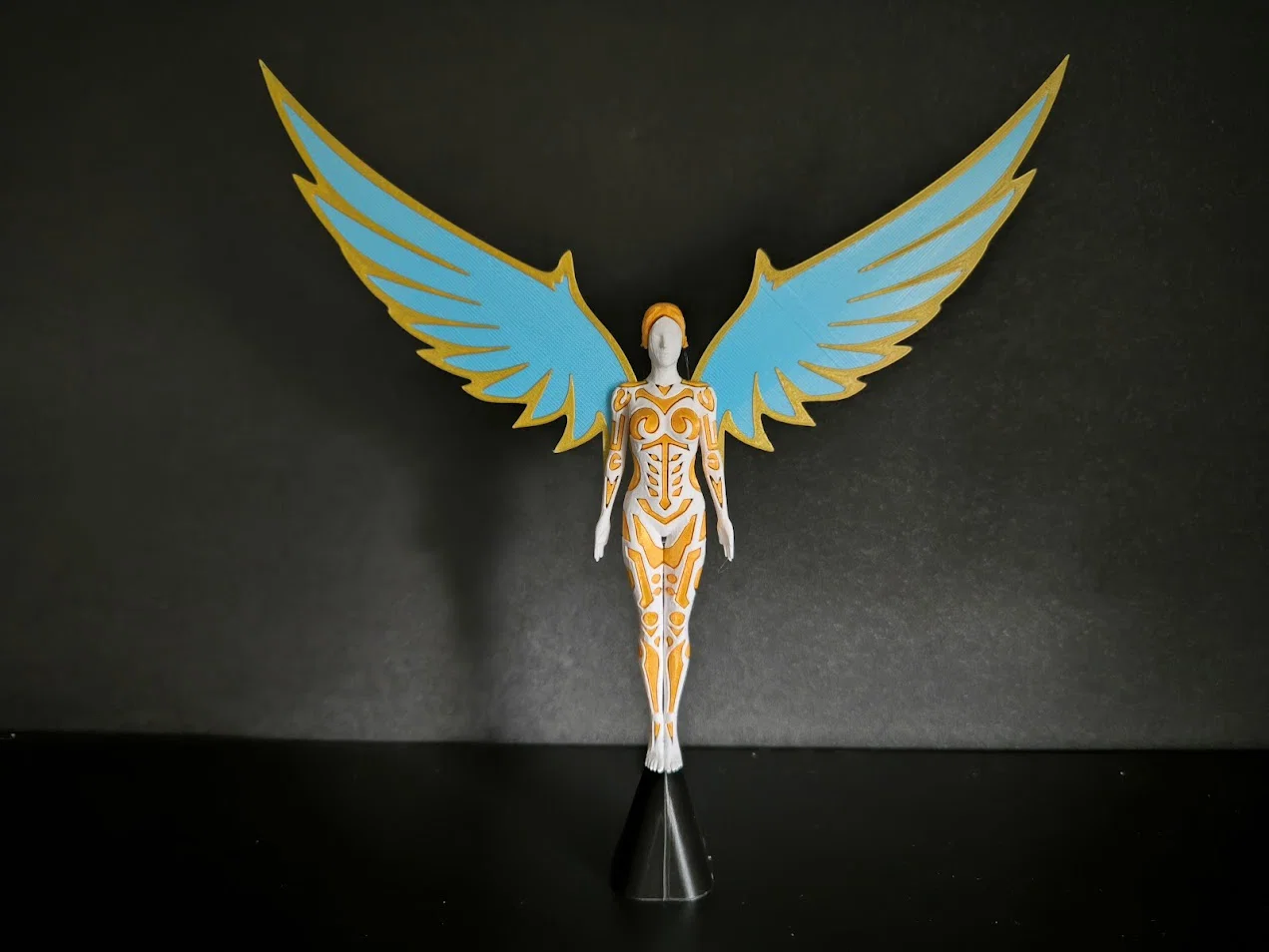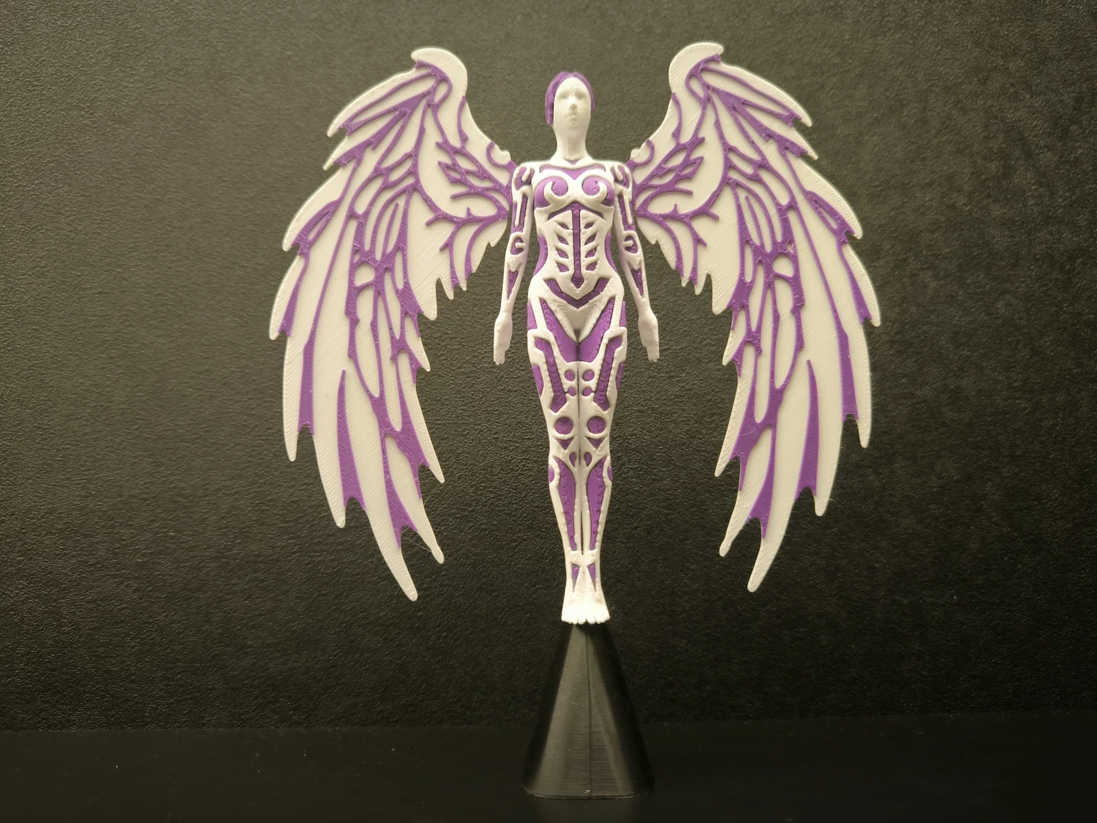 Mẫu thiên thần techno phong cách tương lai, cho phép tùy biến cánh: in thân riêng rồi gắn cánh Fairy hoặc Demon, hoặc tự thiết kế cánh và gắn bằng “Part for you own wings”. In PLA, layer 0,2 mm, nozzle 0,4 mm.
