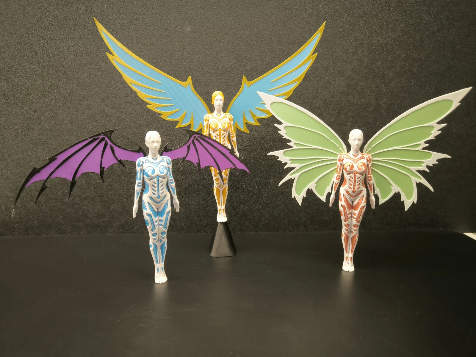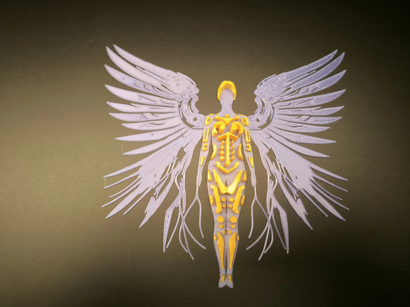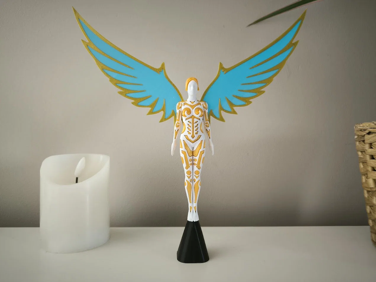 Mẫu thiên thần techno phong cách tương lai, cho phép tùy biến cánh: in thân riêng rồi gắn cánh Fairy hoặc Demon, hoặc tự thiết kế cánh và gắn bằng “Part for you own wings”. In PLA, layer 0,2 mm, nozzle 0,4 mm.