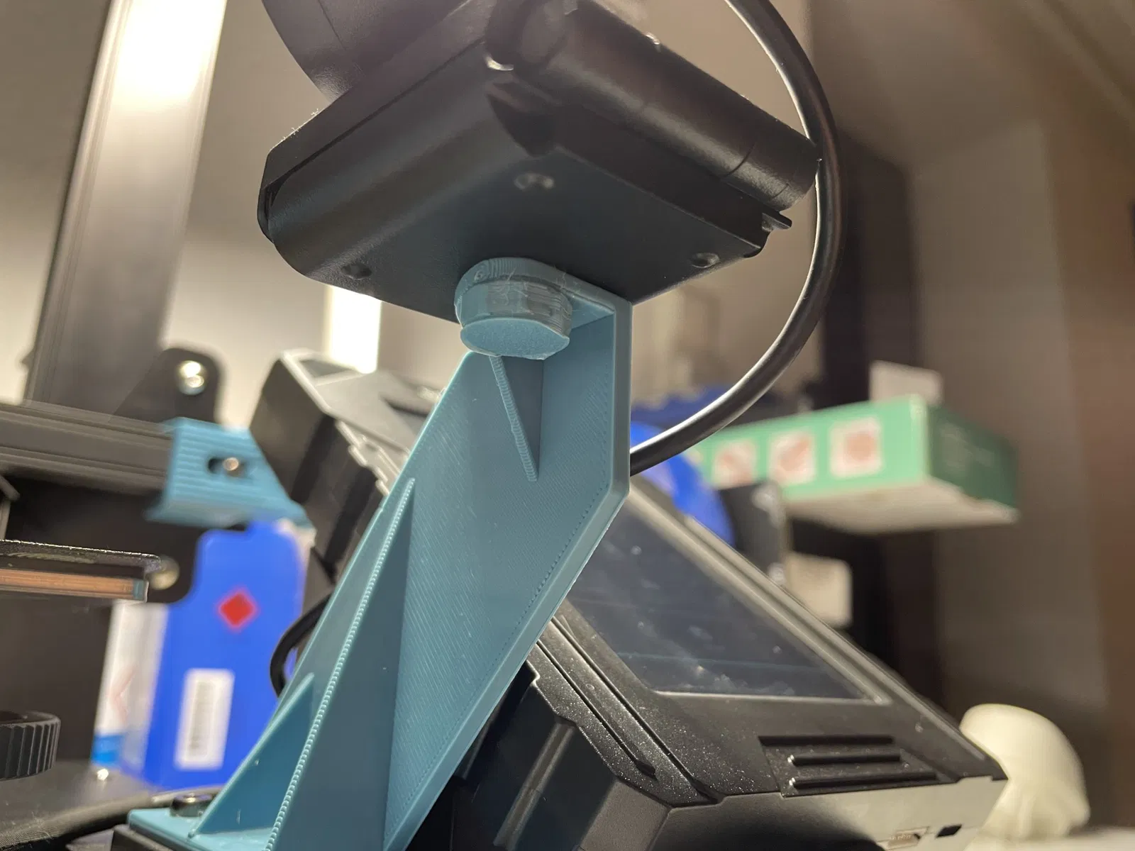 Vì tôi không có Microsoft LiveCam 3000 HD và chỉ có một webcam với tiêu chuẩn ISO 1222/DIN 4503-1/ren máy ảnh 1/4 inch. Tôi không thể tự giúp mình và đã xây dựng mô hình này. Nó cách xa bàn in hơn và được nâng cao lên. Hai loại vít ISO 1222/DIN 4503-1/1/4 inch khác nhau cũng đã được thêm vào.