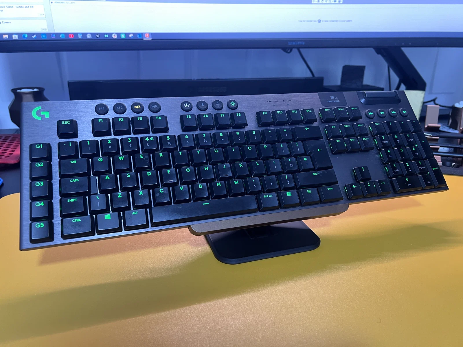 Giờ mình có thể kê bàn phím lên khỏi mặt bàn và chỉnh góc nghiêng cho hợp. Đủ vững để gõ và nhìn cũng khá ổn nữa.