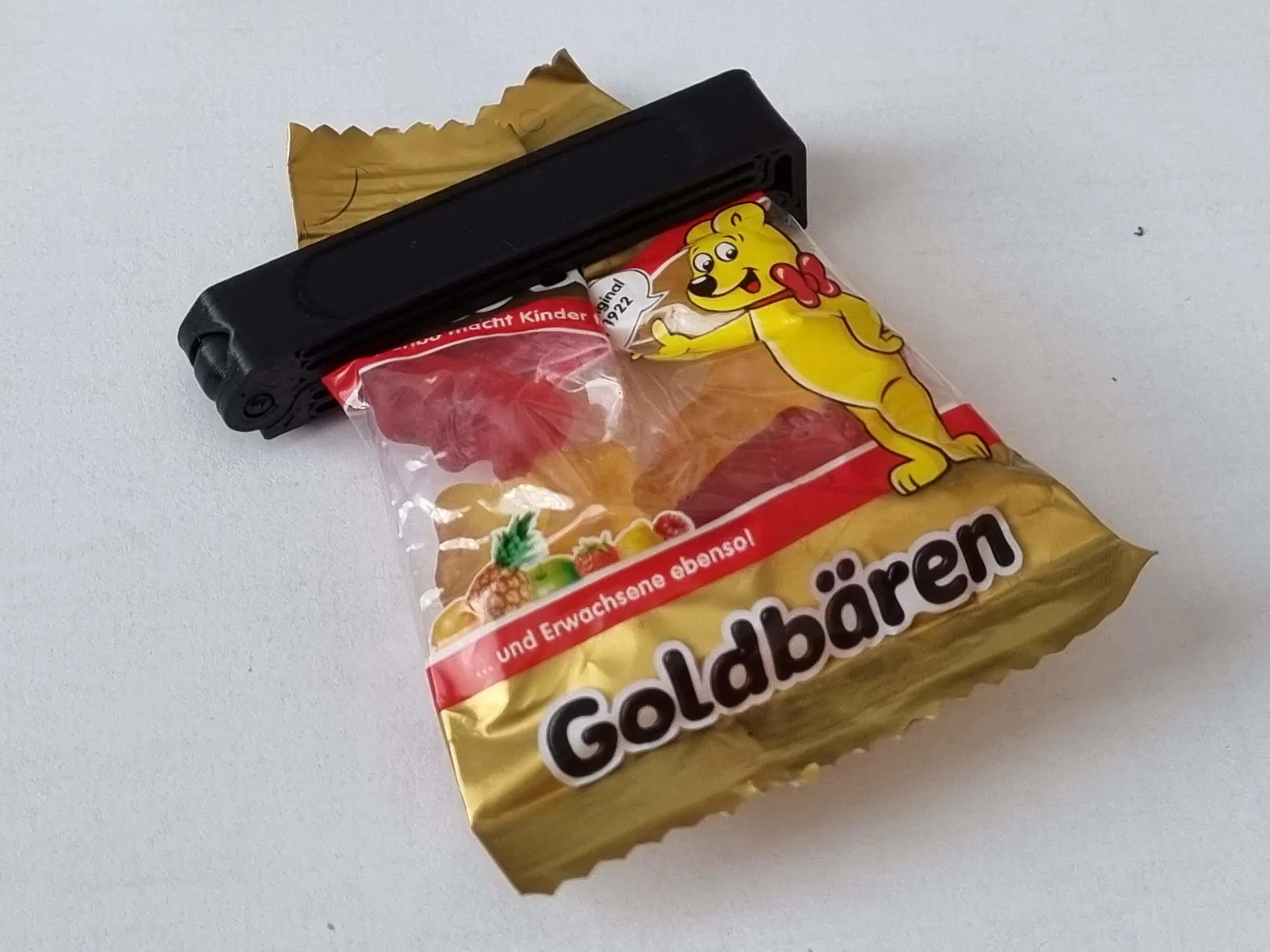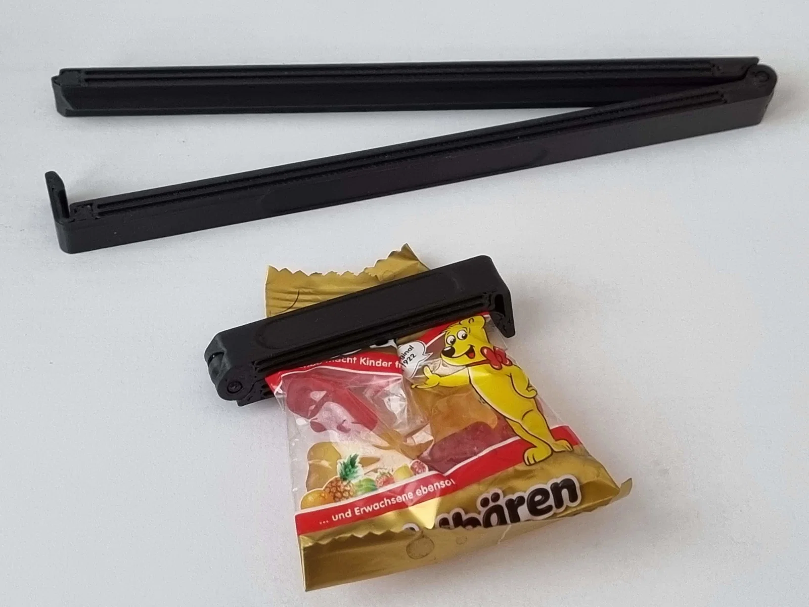 Kẹp miệng túi print-in-place dựa trên bản lề của neoyarus, thêm cơ chế kẹp khóa chắc hơn (snap fit) thay cho bản lề thứ hai. Có ZigZag gia cường, tay kẹp uốn để tăng lực kẹp, kèm rãnh bám hai bên. In đẹp nhất với PETG, PLA cũng ổn.