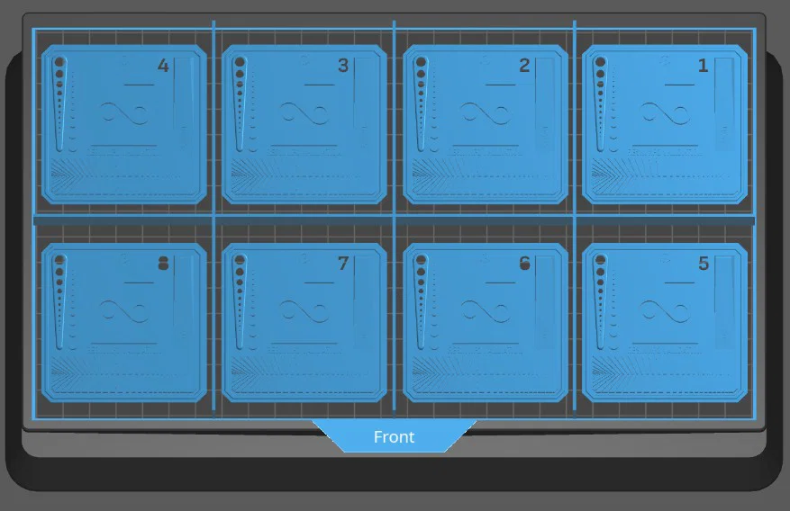 Với các máy in như Saturn 4 Ultra có hỗ trợ hiệu chuẩn resin bằng cách in nhiều mức exposure trong cùng một lần in, sau khi in xong thường khó phân biệt đâu là mức exposure nào. Để khỏi phải tháo ra và vệ sinh từng cái một, đây là bản làm lại gồm 8 matrix XP2 được đánh số từ 1 đến 8.