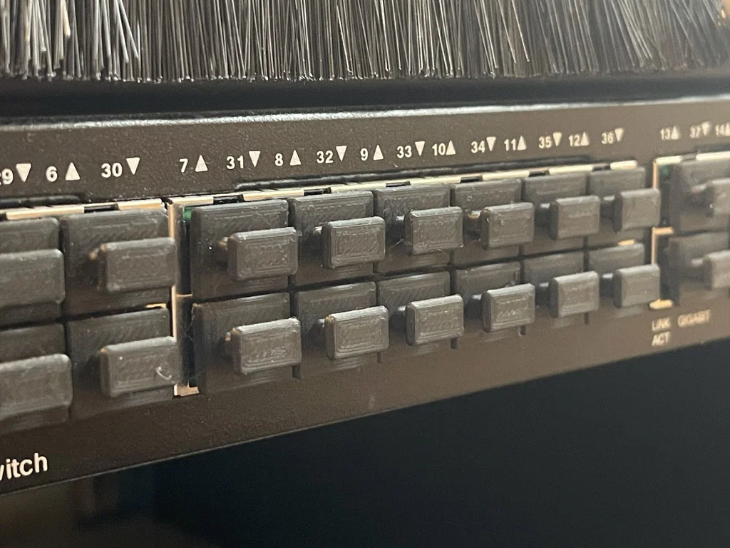 Nắp che bụi RJ45 có pull tab để tháo ra nhanh. Thiết kế đủ rộng che kín cổng nhưng vẫn gọn, dùng được cho các cổng RJ45 đặt sát nhau trên switch/router và thiết bị mạng khác. In PLA dễ.