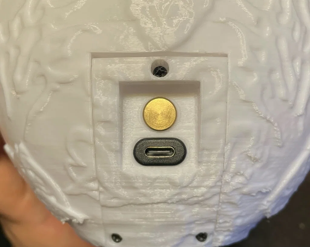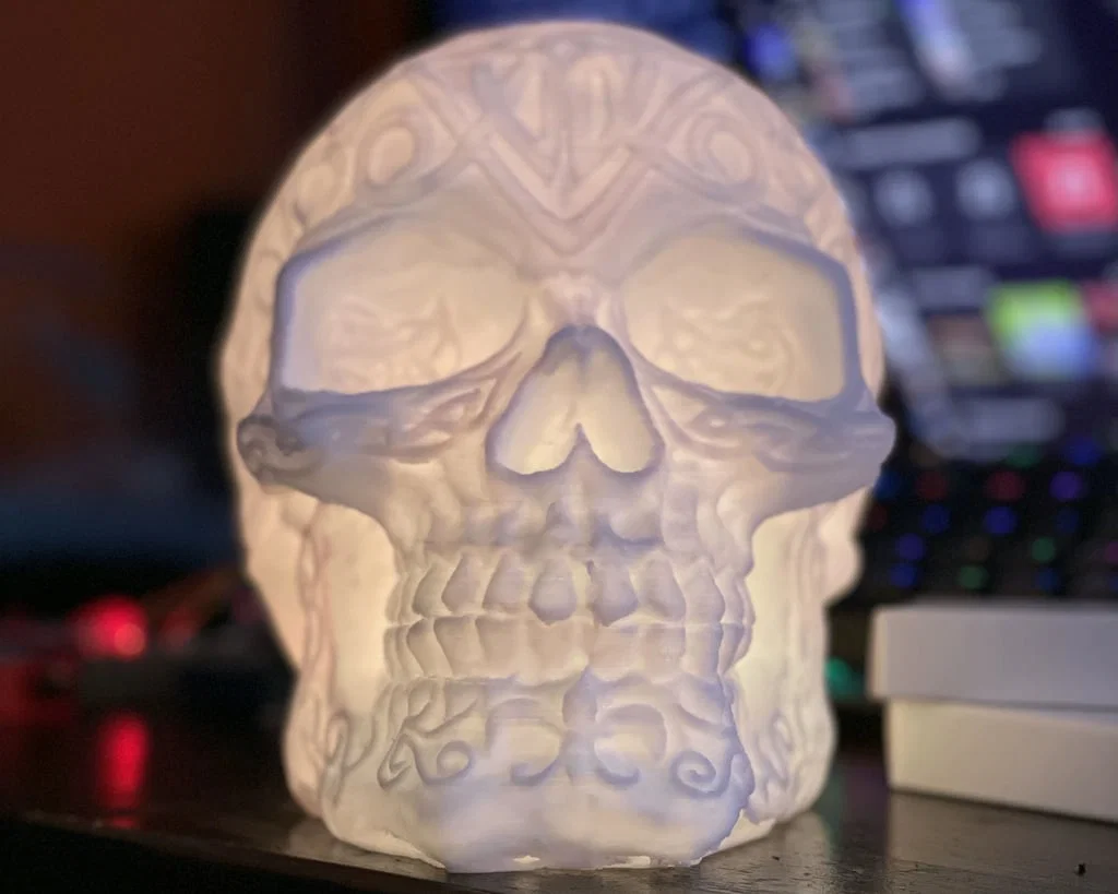Mẫu Celtic Skull có đèn RGB chạy pin sạc, kèm remote và nút cảm ứng phía sau để bật/tắt, đổi màu và chế độ. Có thể vừa dùng vừa sạc qua cổng USB-C. Đã tinh chỉnh cho dễ in hơn và có 3 kích cỡ.