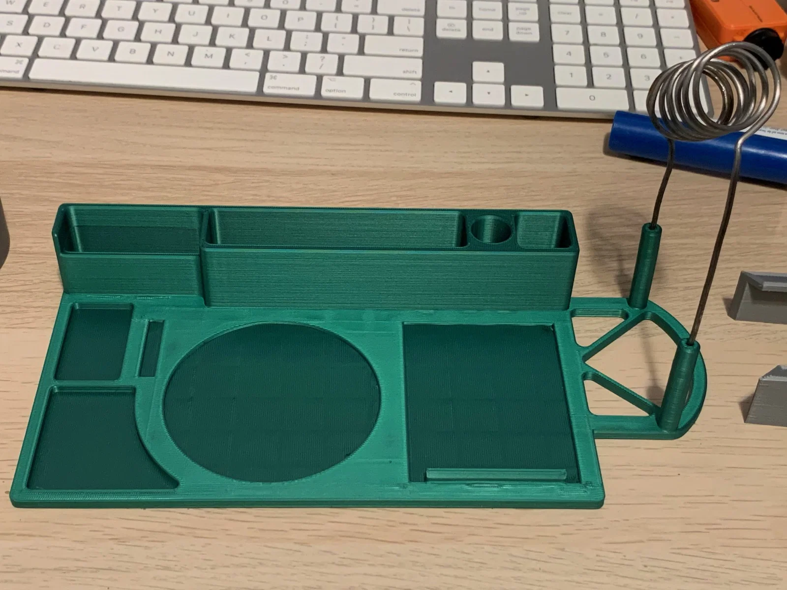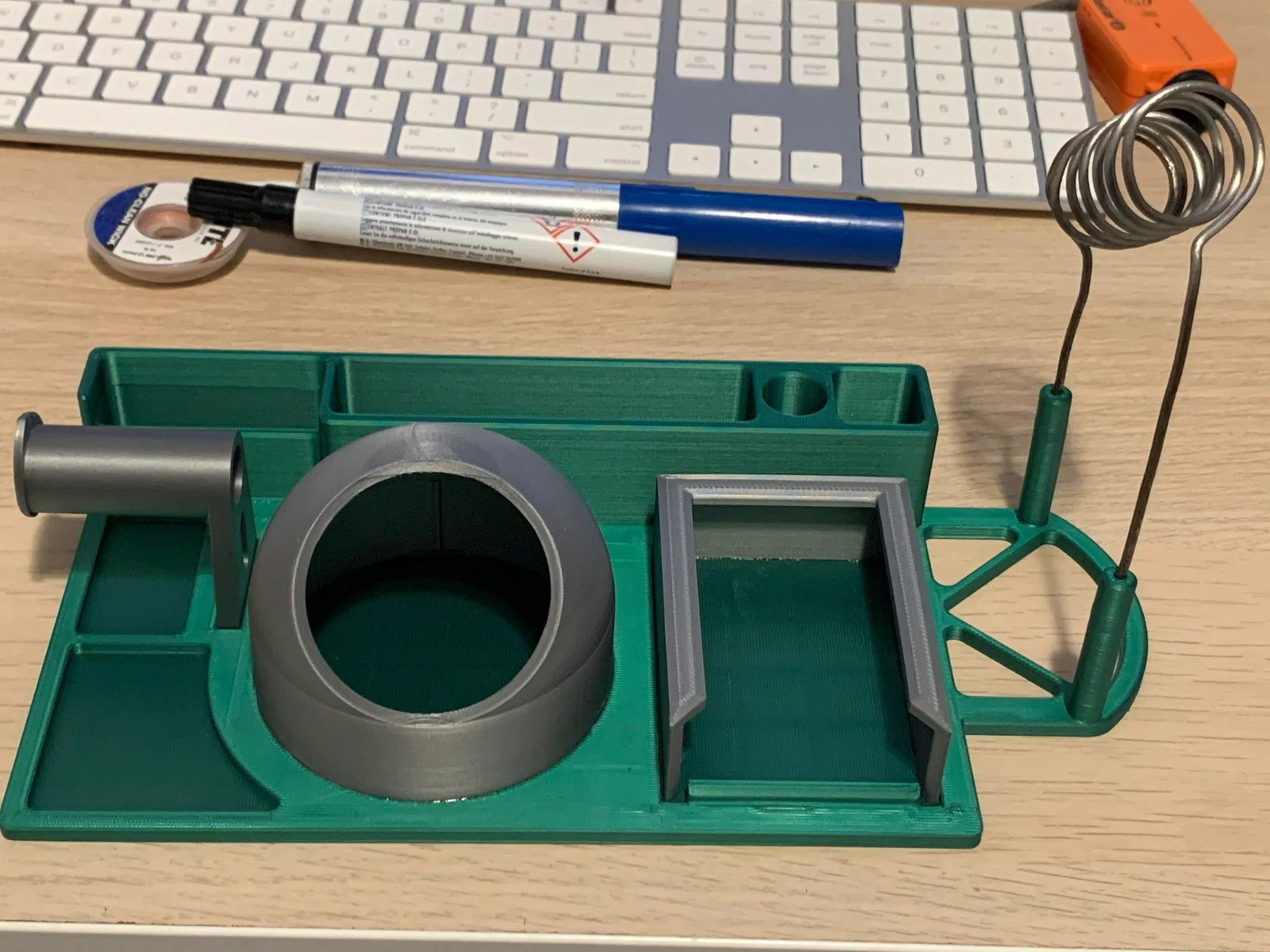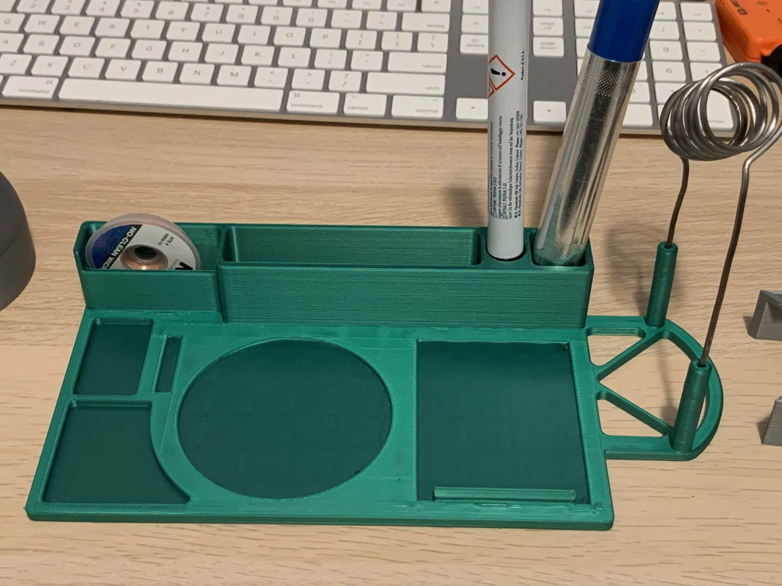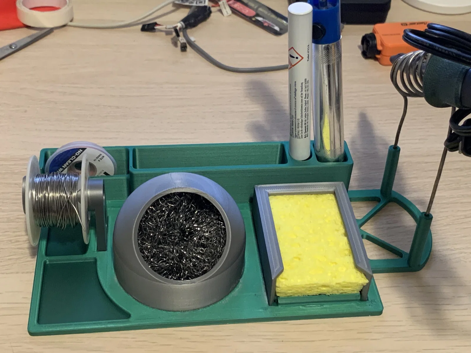 Trạm hàn với chỗ để sắt, bọt biển, len thép, giá đỡ cuộn hàn và các vật dụng khác. Đế làm bằng PLA và các phần khác là ABS. Cuộn giữ sắt được làm từ một phần của móc treo. Cũng có một cái khay nhỏ ở phía trước, để các bộ phận nhỏ (trong khi bạn làm việc).