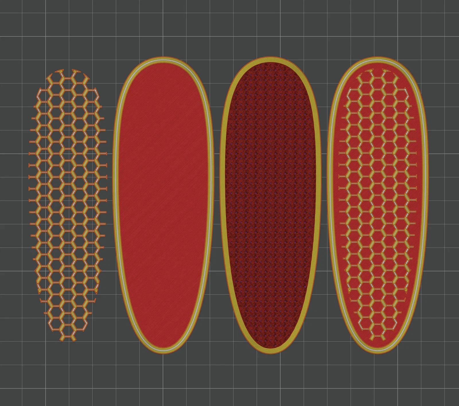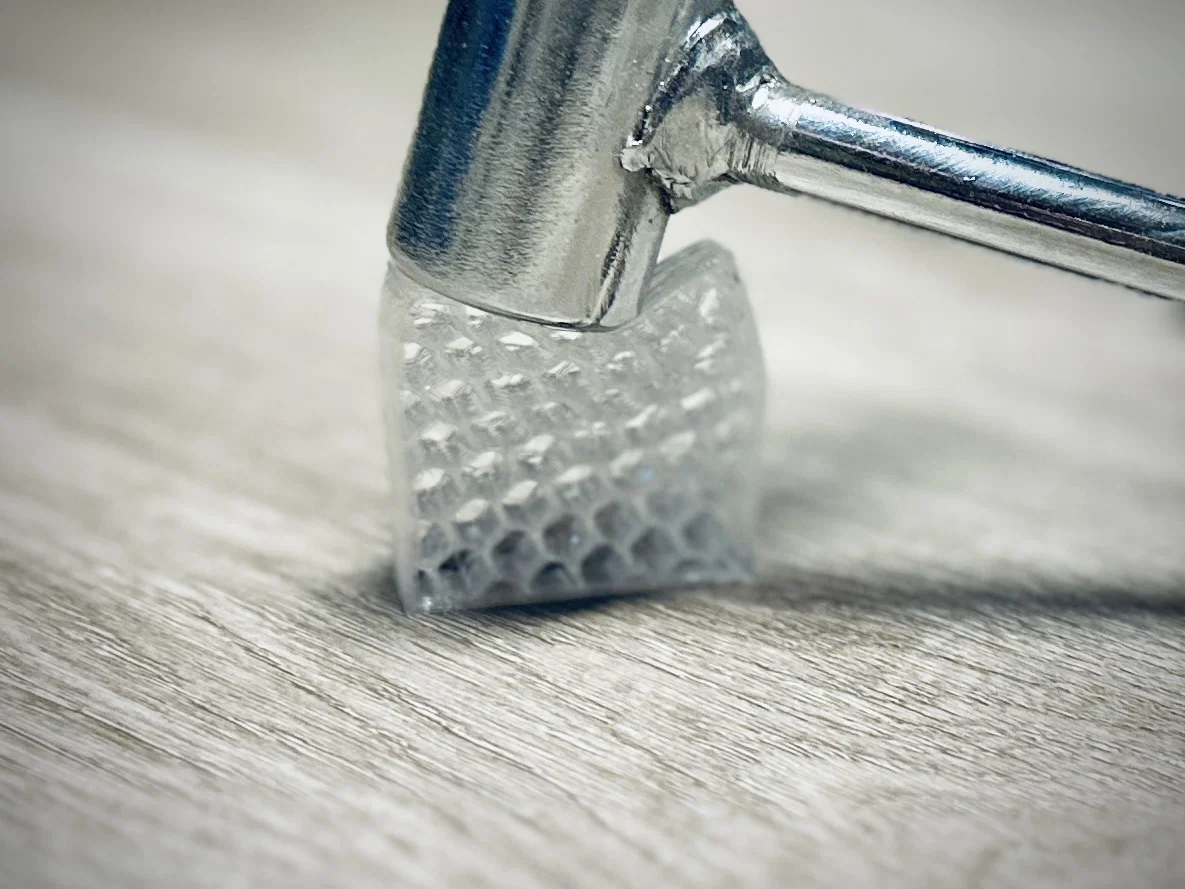 Chèn bất kỳ miếng đệm dày 3/8" vào phần rỗng trước khi tiếp tục in. Có thể in họa tiết honeycomb bằng một loại TPU (ví dụ 85A) và dùng loại khác cho phần thân còn lại (ví dụ 95A)