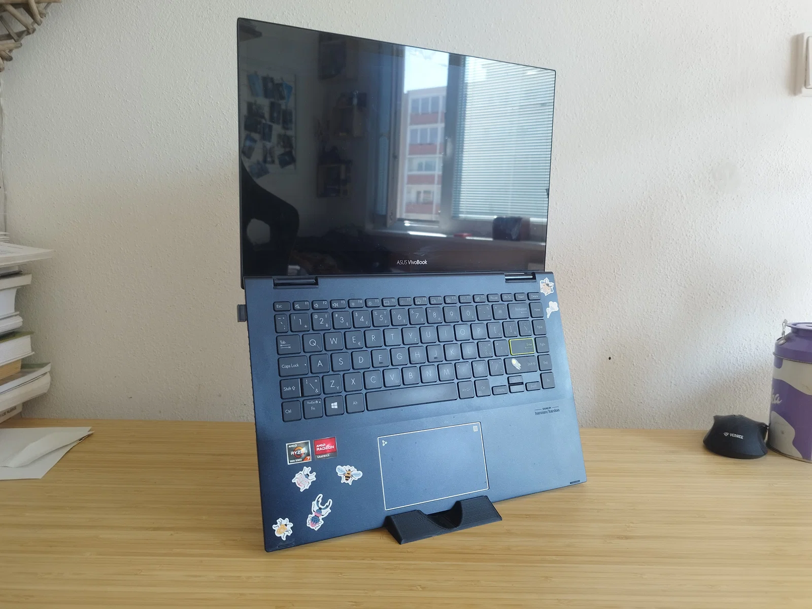Thiết kế này dùng để giữ laptop ở tư thế mở theo chiều dọc (vertical) nhằm cải thiện tư thế cơ thể khi làm việc. Mình không khuyến nghị dùng bàn phím laptop trong lúc sử dụng kiểu dựng này; thay vào đó nên dùng thêm một bàn phím rời.