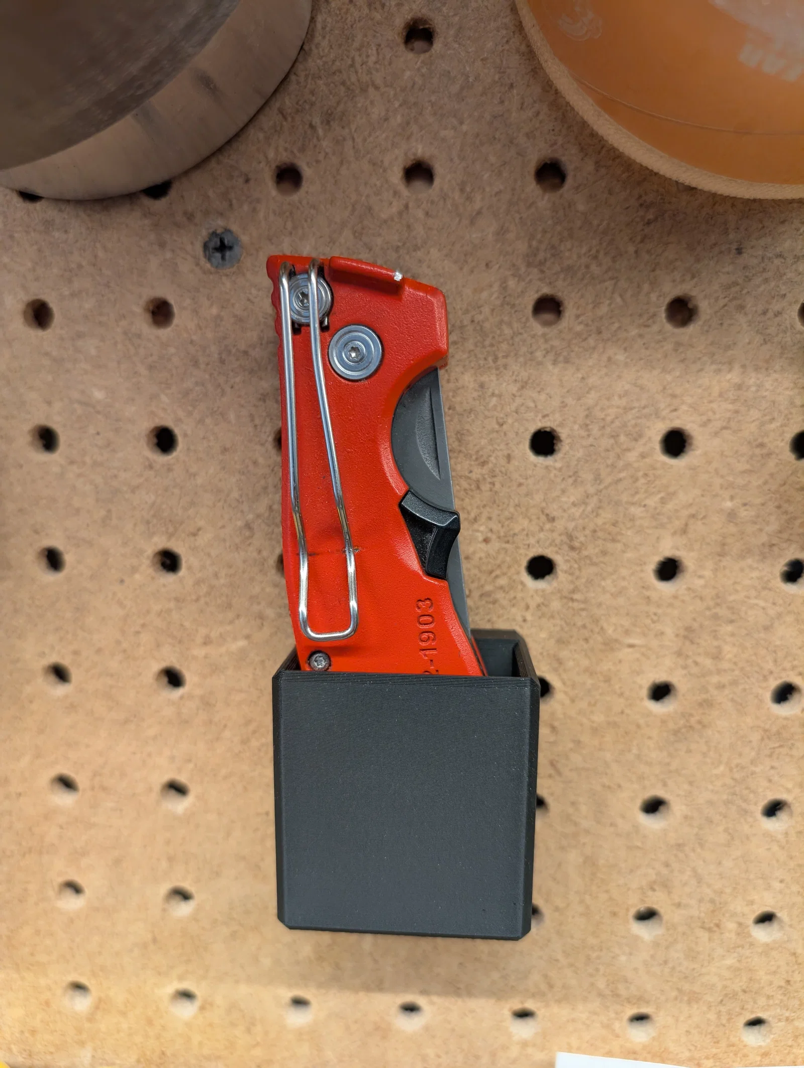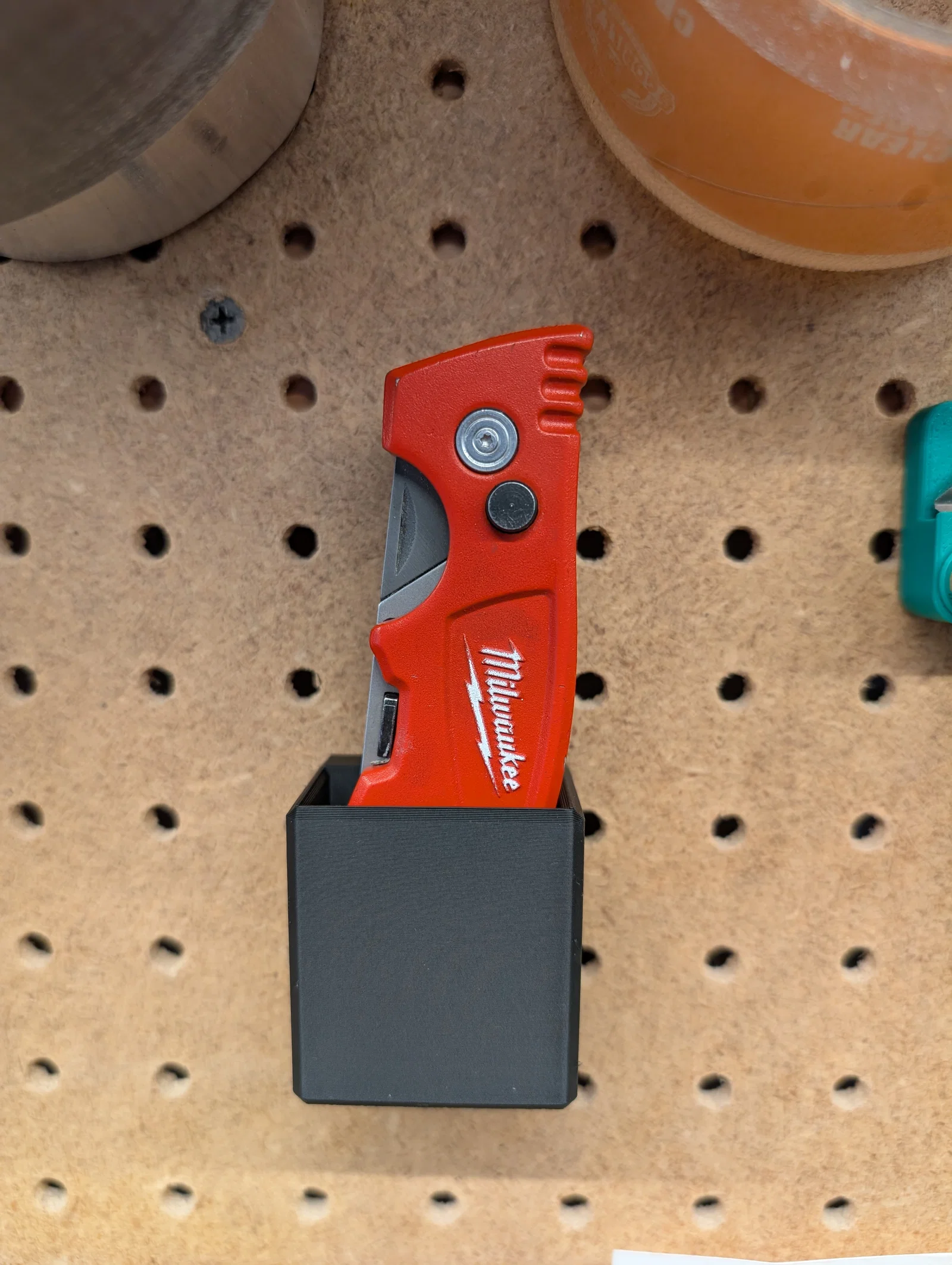 Holder tương thích Sy’s Peglock cho dao Milwaukee Fastback 48-22-1903 (bản lớn, có chứa lưỡi dự phòng). Gồm 2 file STL: một để clip quay ra sau, một để clip quay ra trước khi gắn lên pegboard.