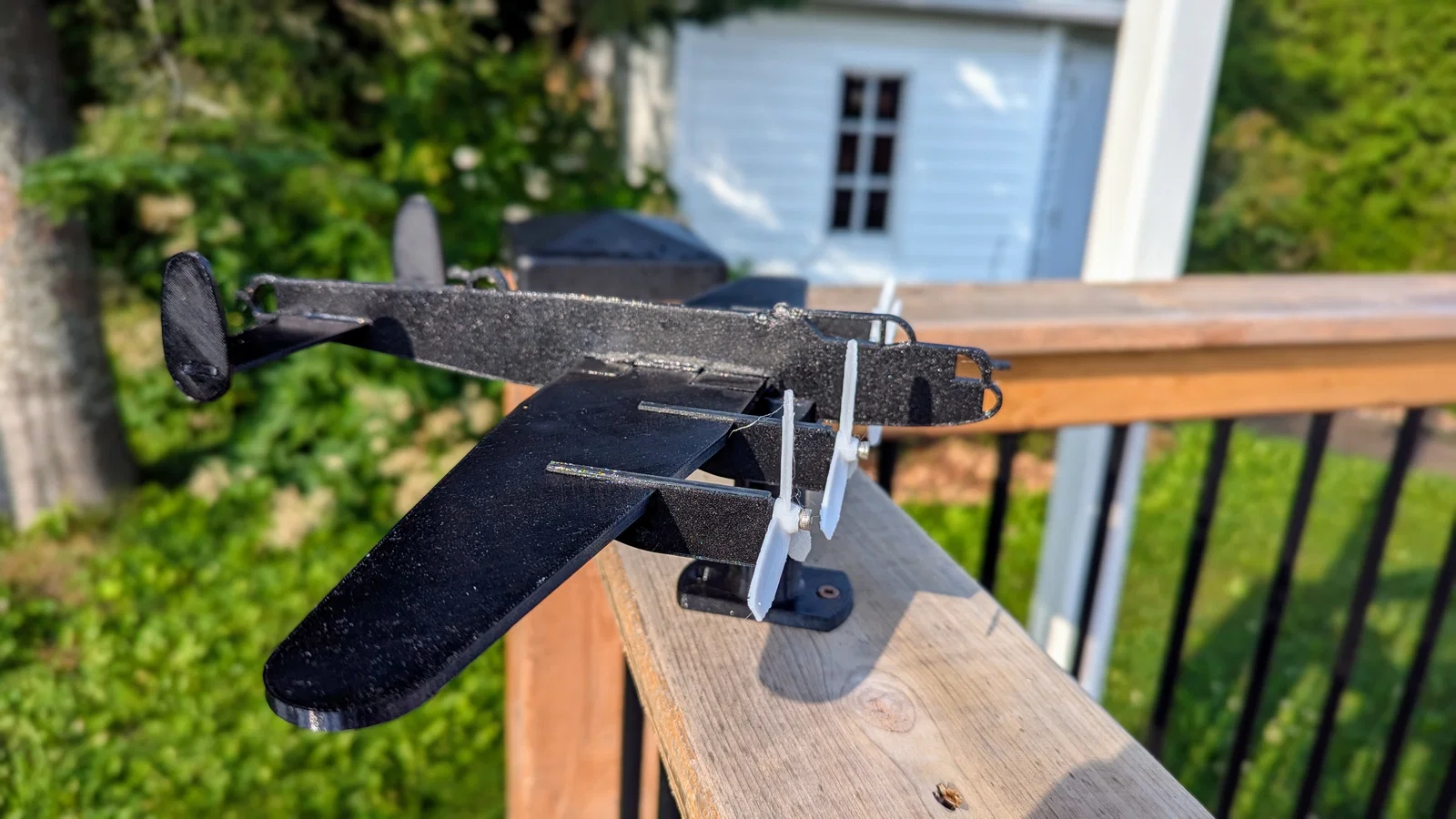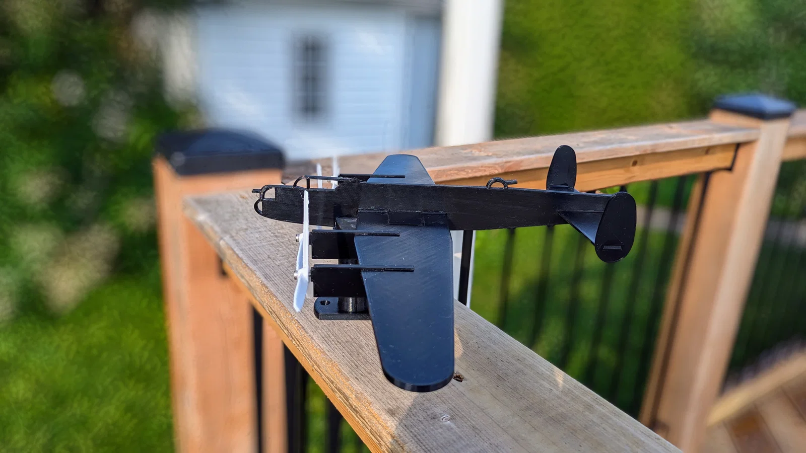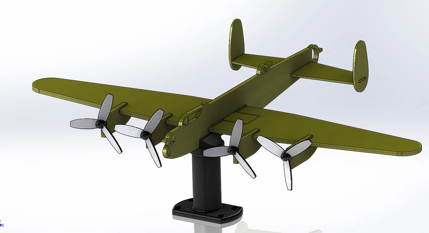 Mô hình máy bay ném bom WW2 Avro Lancaster in PETG, 20% infill. Cánh quạt quay theo gió và thân máy bay xoay theo hướng gió. Lắp bằng 5 ốc M3x8mm, phần đế dùng 2 ốc #10 countersink, còn lại dán keo.