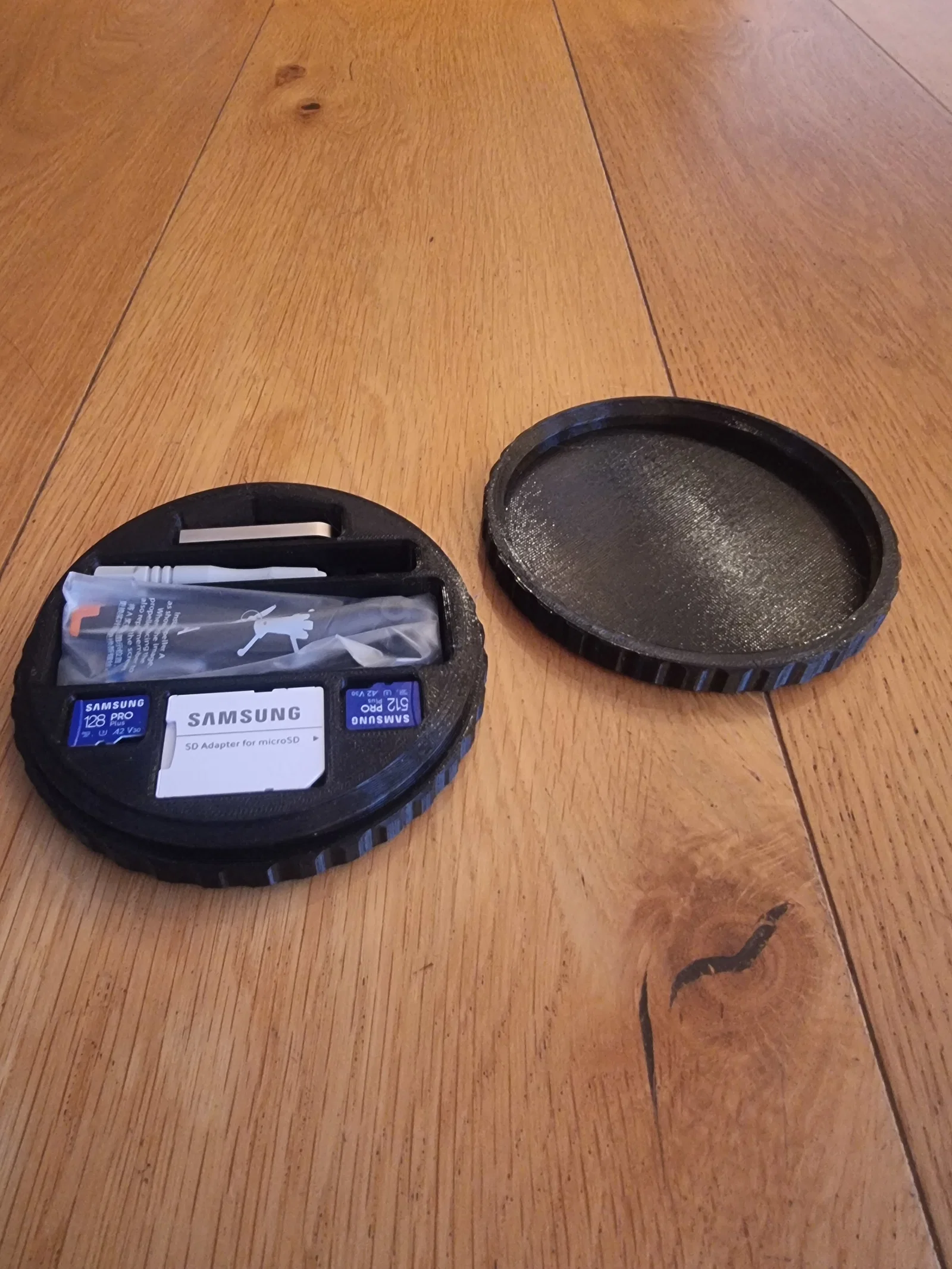 Bản remix hộp vặn ren cho DJI Mini để tận dụng tối đa không gian bên trong. Đựng được cánh quạt và ốc cho hơn một lần thay full bộ, kèm chỗ để thẻ microSD và SD full-size/adapter.