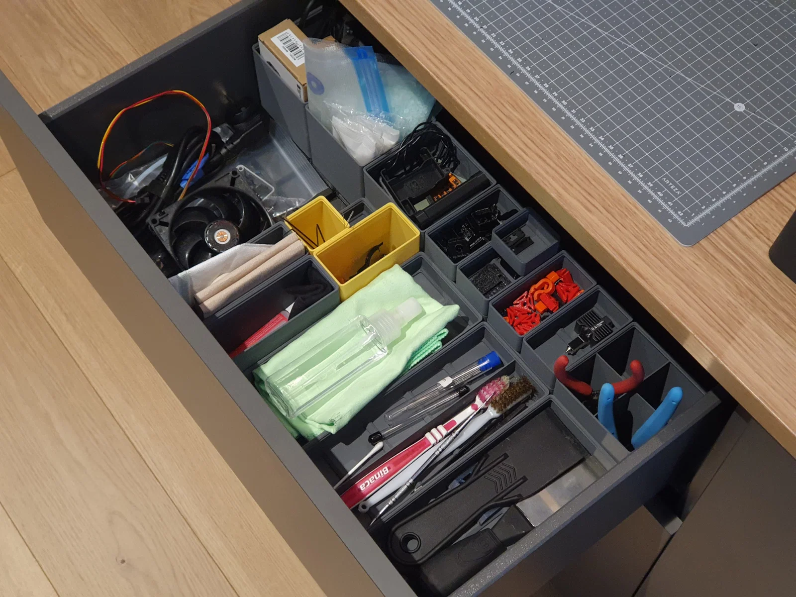 Sau khi mình đã lấp đầy vài ngăn kéo Ikea ALEX bằng các Gridfinity bin, mình quyết định làm y chang vậy cho những ngăn kéo khác trong nhà (hơi “sốc” ha)