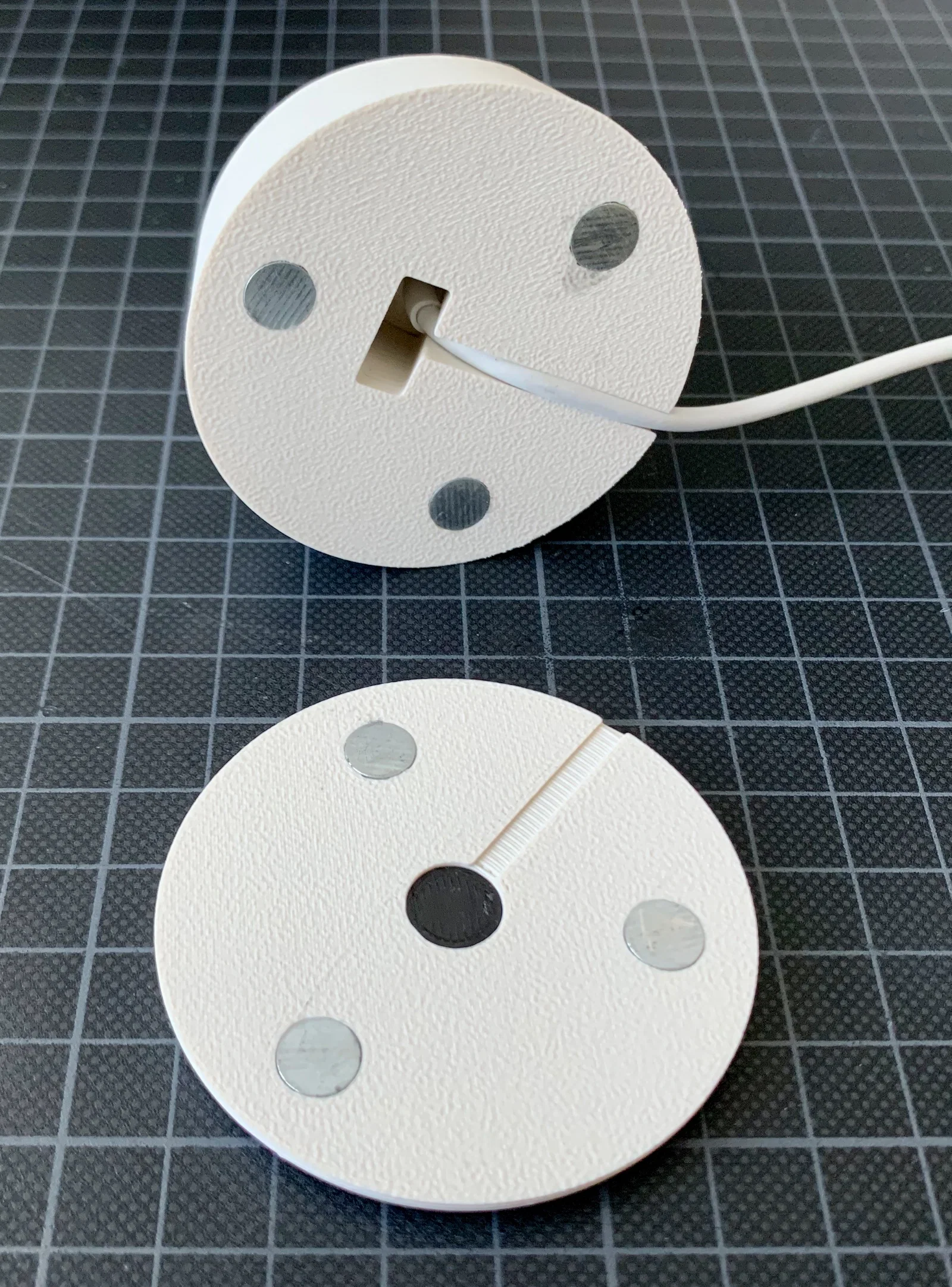Mình đã tách mẫu thành 2 phần (trên và dưới) vì muốn giấu dây cáp ở phần đáy và đồng thời nâng cao dock lên. Ngoài ra mình còn thiết kế thêm một miếng đệm cho phần đáy để in bằng flex filament (Ninjaflex, TPU) nhằm giúp dock không bị trượt trên bề mặt kính.