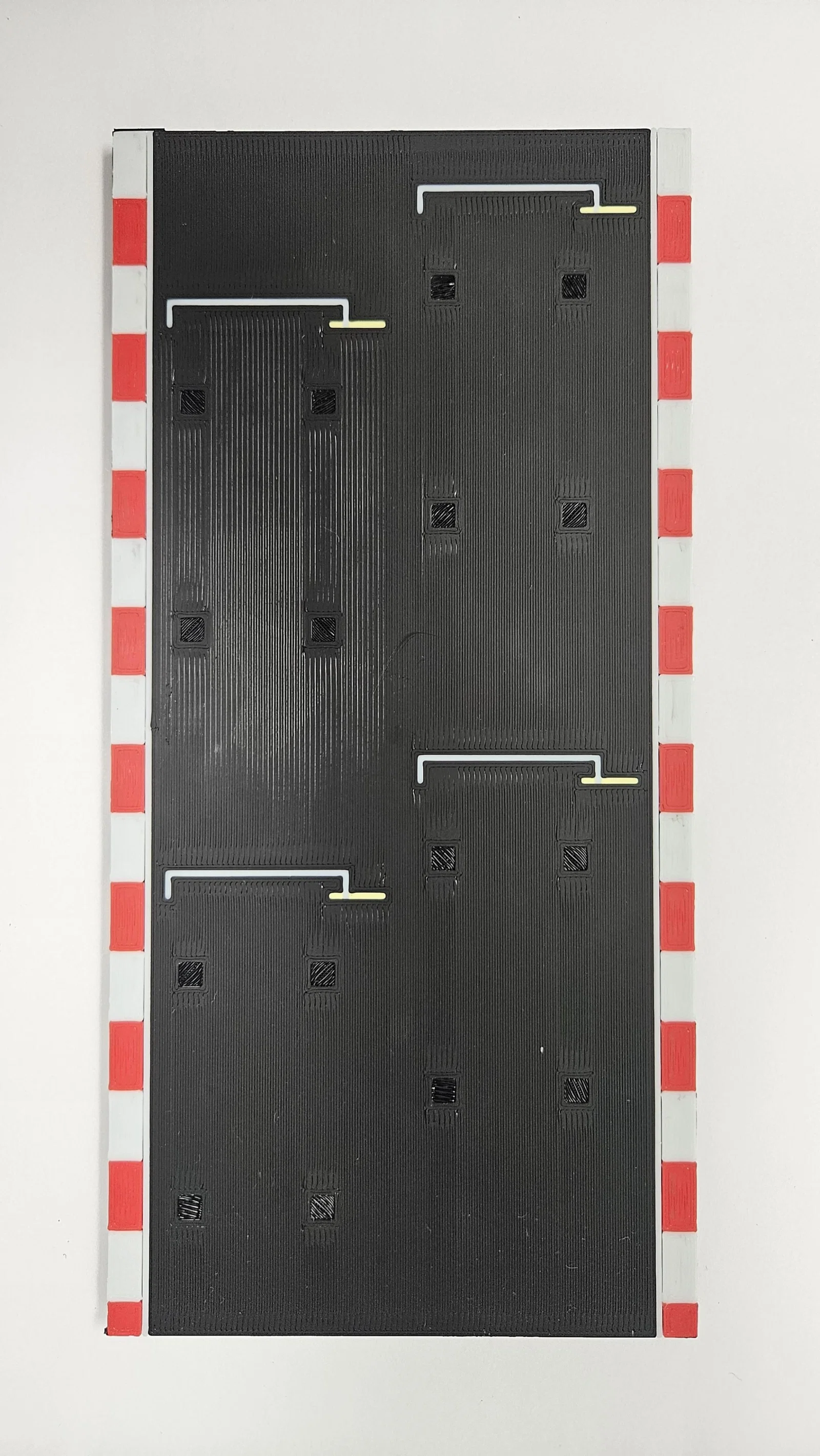 Vạch xuất phát đường đua tỉ lệ 1/64 cho 4 xe, có rãnh lõm giúp canh giữa xe khi lăn. Khuyến nghị in nghiêng 45° để vân song song, hoặc lật ngược in úp cho bề mặt textured. Yêu cầu AMS.