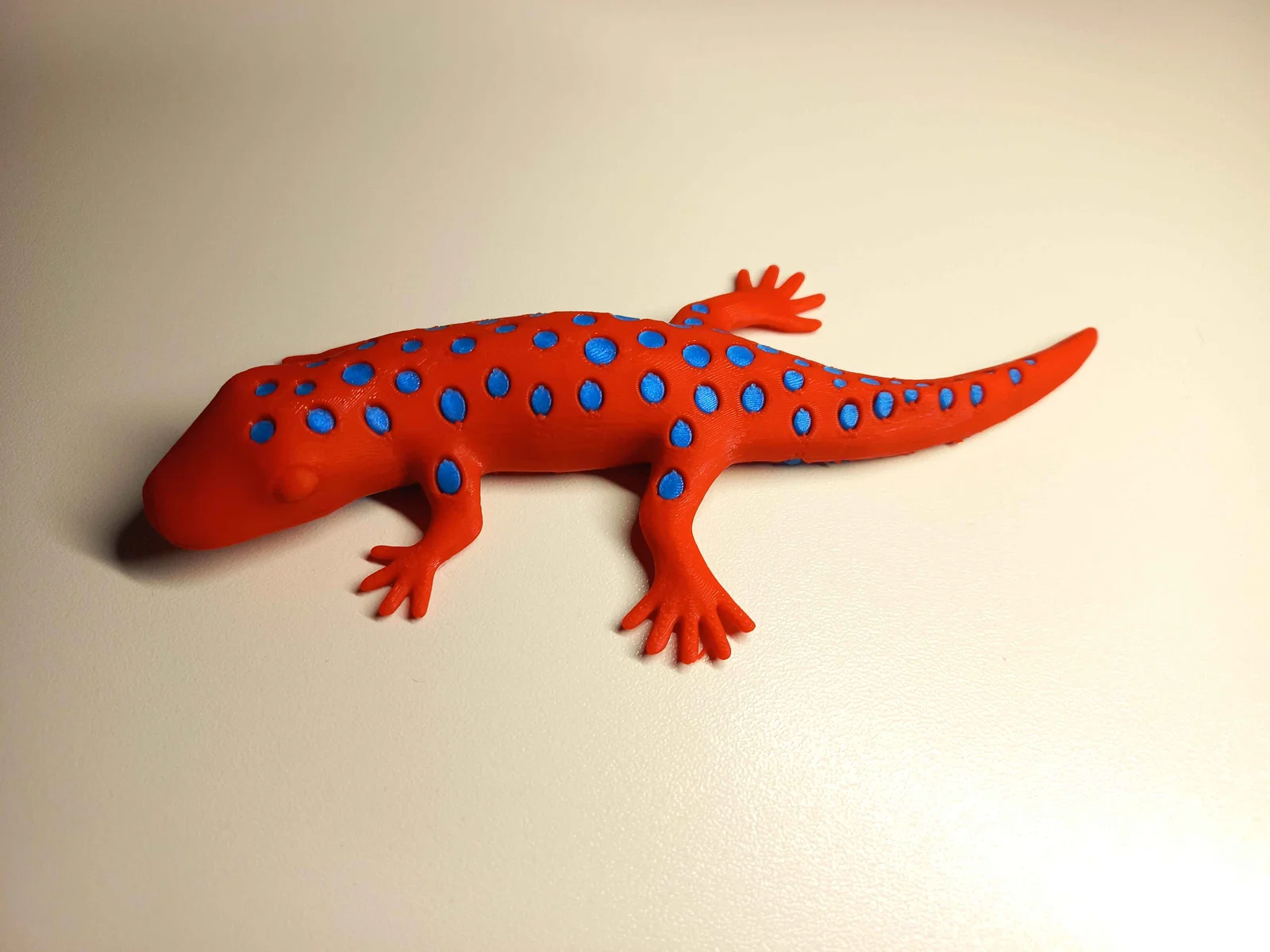 Mẫu salamander dùng kỹ thuật dual color với single extruder. Mỗi con in thành 2 phần riêng rồi trượt lắp vào nhau. Có kèm file fusion360 để chỉnh tolerances và bản decimated ít triangles, dễ dùng cho dự án.