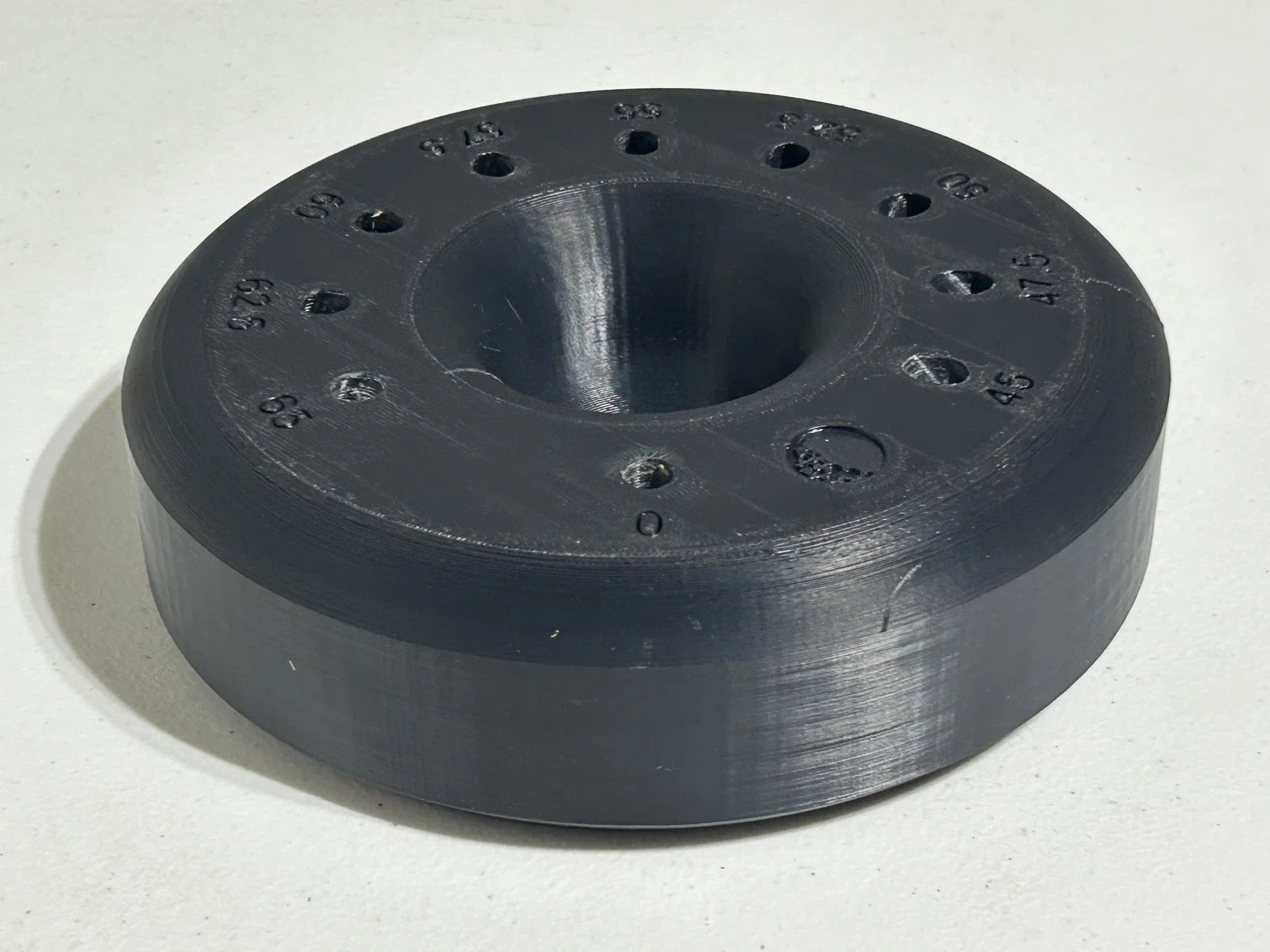 Đĩa holder cho golf alignment stick với 10 vị trí lỗ góc (0–65°), cố định bằng tee golf tiêu chuẩn cắm xuống đất và có thể xoay. Lỗ stick 8.5mm, lỗ tee 6.5mm, nặng ~135g; in ASA, 5% infill.