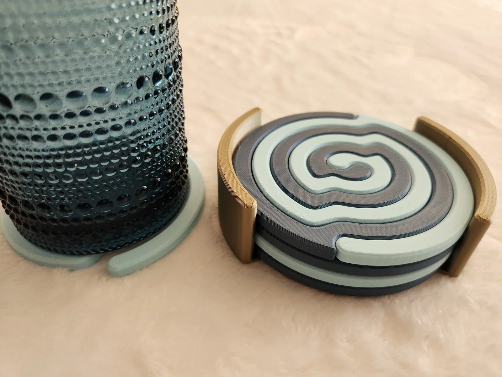 Một mẫu lót ly thú vị, thiết kế để hai miếng cùng hình có thể lồng/khóa (interlock) vào nhau để cất gọn, rồi dùng riêng từng miếng hoặc ghép đôi đặt dưới ly. Ngoài ra còn có kèm một đế đựng lót ly (tùy chọn) có thể chứa tối đa 10 miếng lót (tức 5 cặp đối xứng).