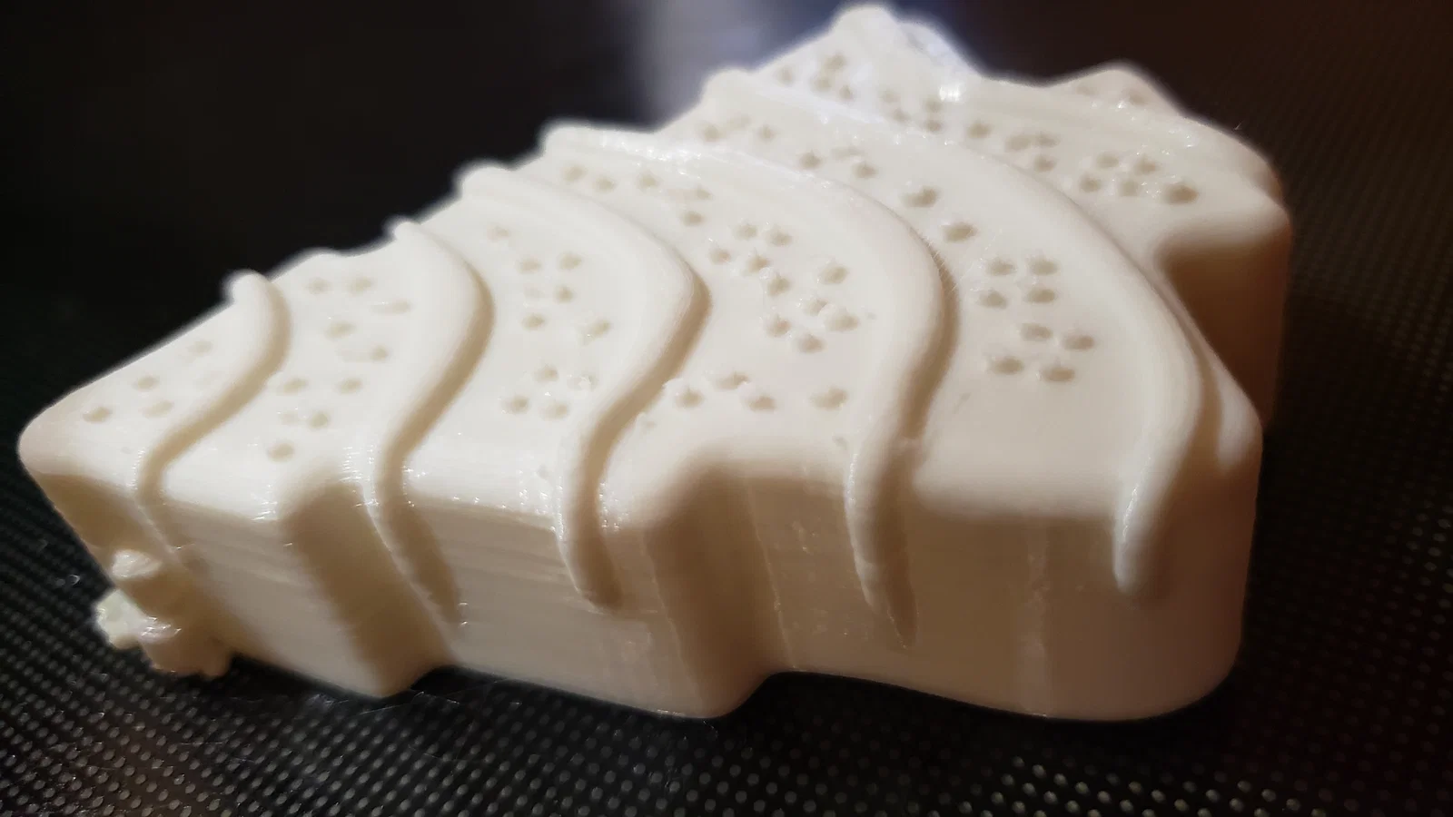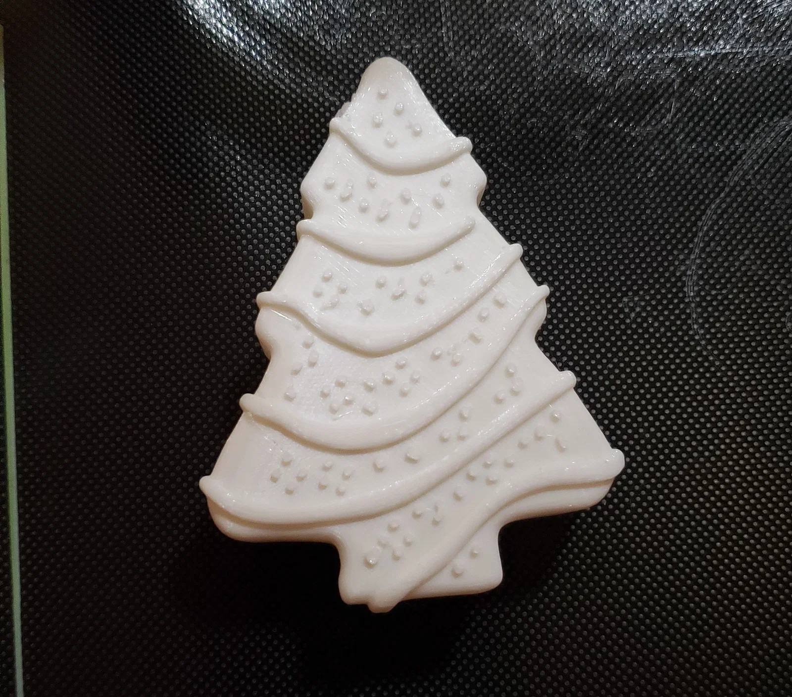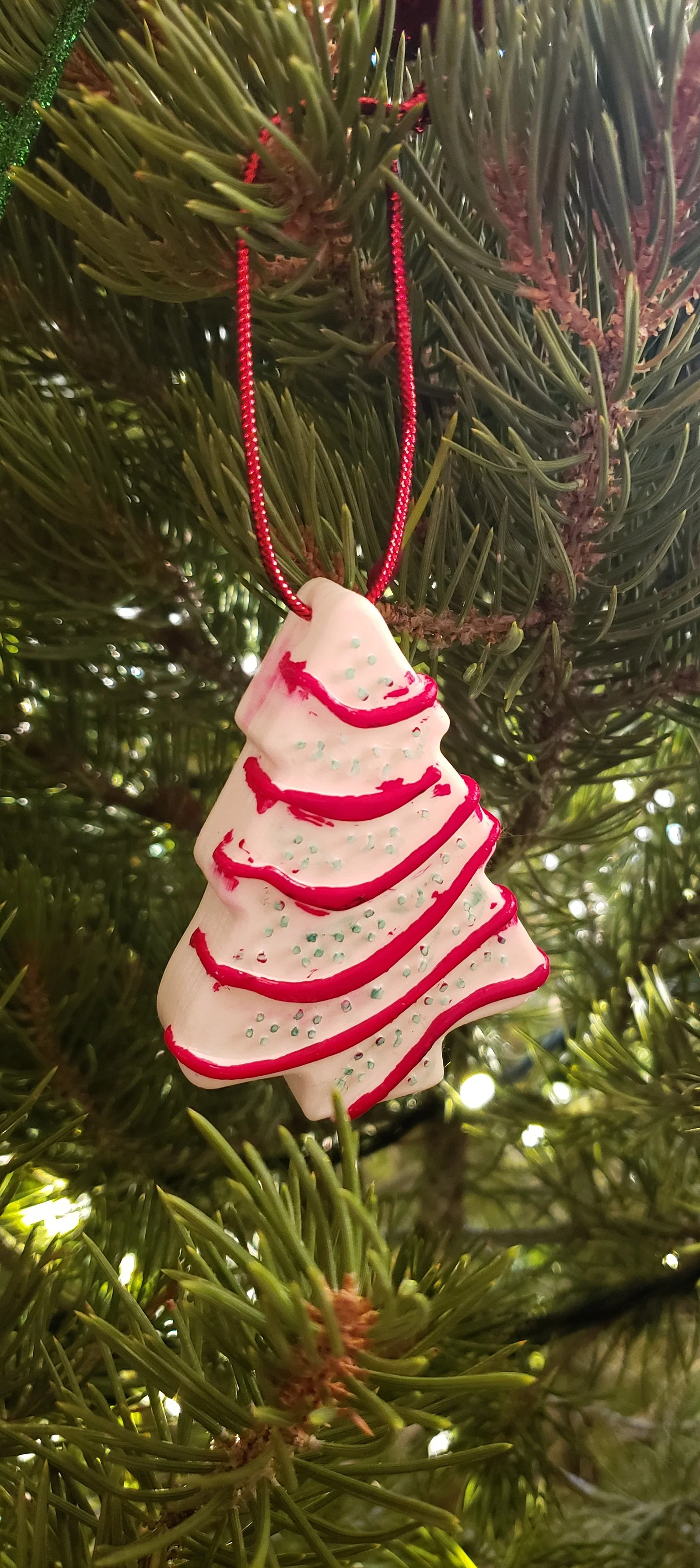 Mẫu Debbie Cake Christmas Ornament có lỗ 5 mm để luồn dây/ribbon treo cây. Gợi ý thông số in: White Creality PLA, nozzle 210°C, bed 70°C, layer .16mm, infill 15%. Supports ở lỗ có thể khó tháo.