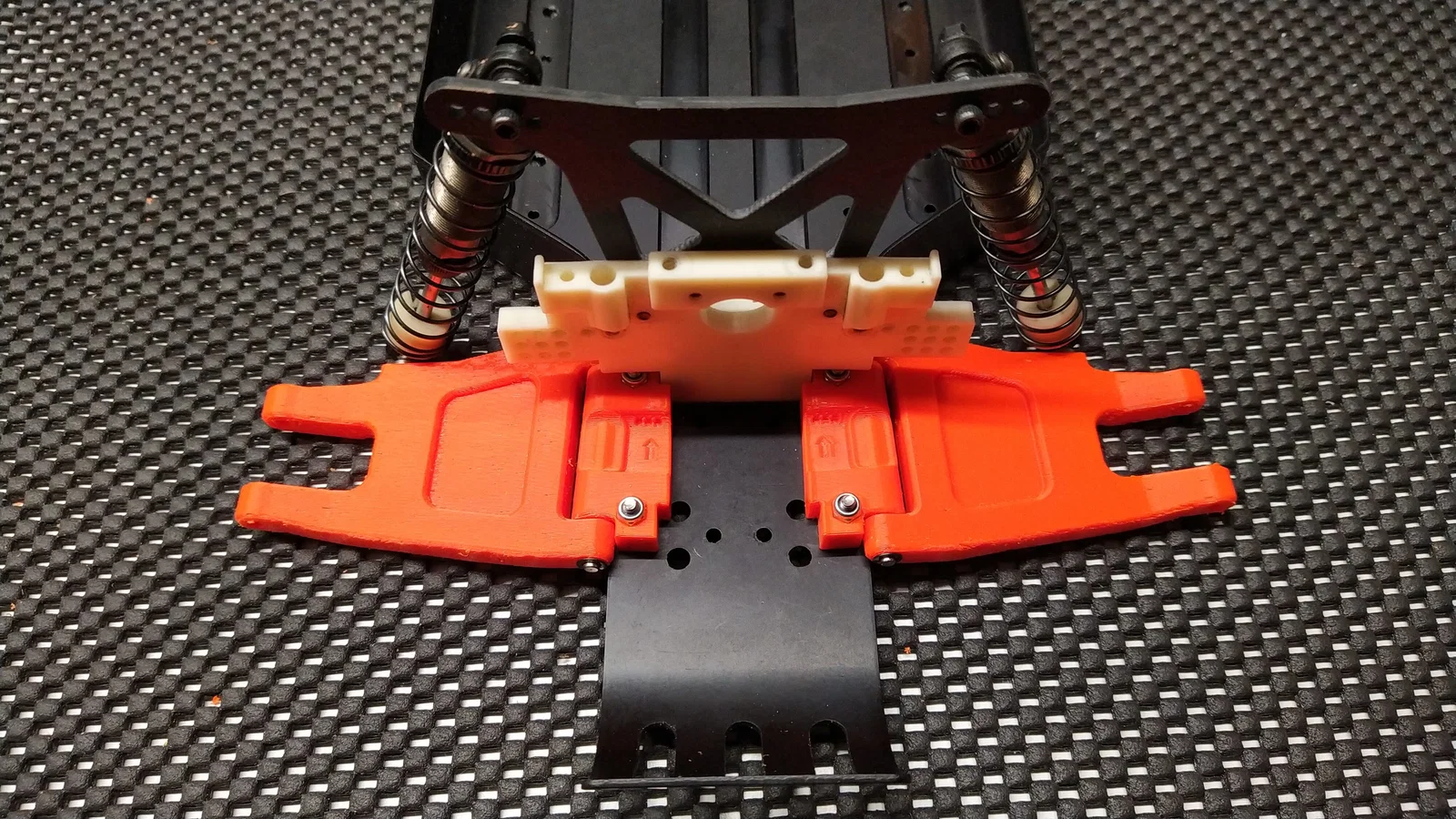 In các chi tiết theo tư thế dựng đứng (upright), với các lỗ chốt bản lề (hinge pin) và lỗ bắt phuộc (shock mounting holes) hướng lên trên. Làm vậy phần lỗ chốt sẽ chắc hơn và càng (arms) không bị xoắn ngay cả khi in bằng PETG.
