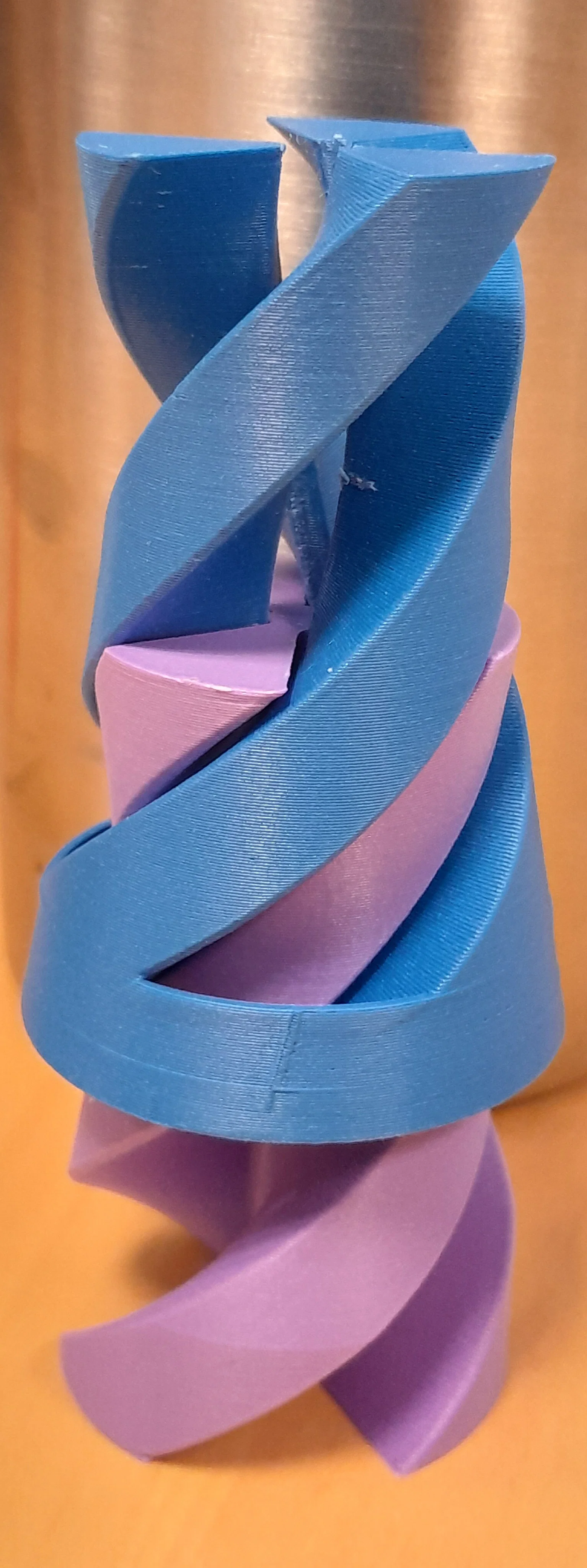 Mình thử làm dạng câu đố impossible passthrough với mẫu tháp làm mát này, nhìn khá giống mấy cái ở chỗ mình làm. Khe hở (clearance) giữa hai phần là 0.3 mm; lần test đầu mình thử 0.2 mm thì bị quá chặt, còn 0.5 mm thì lại hơi lỏng.