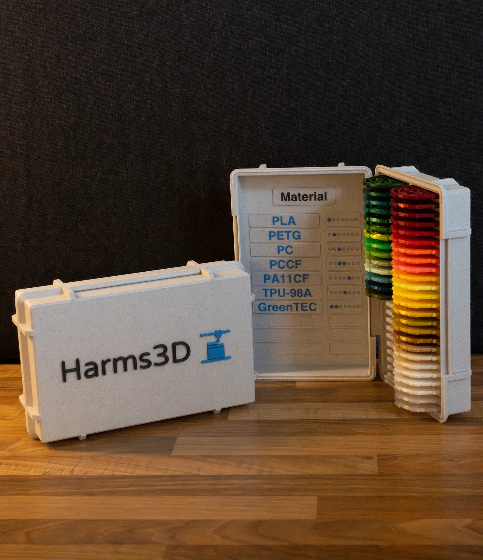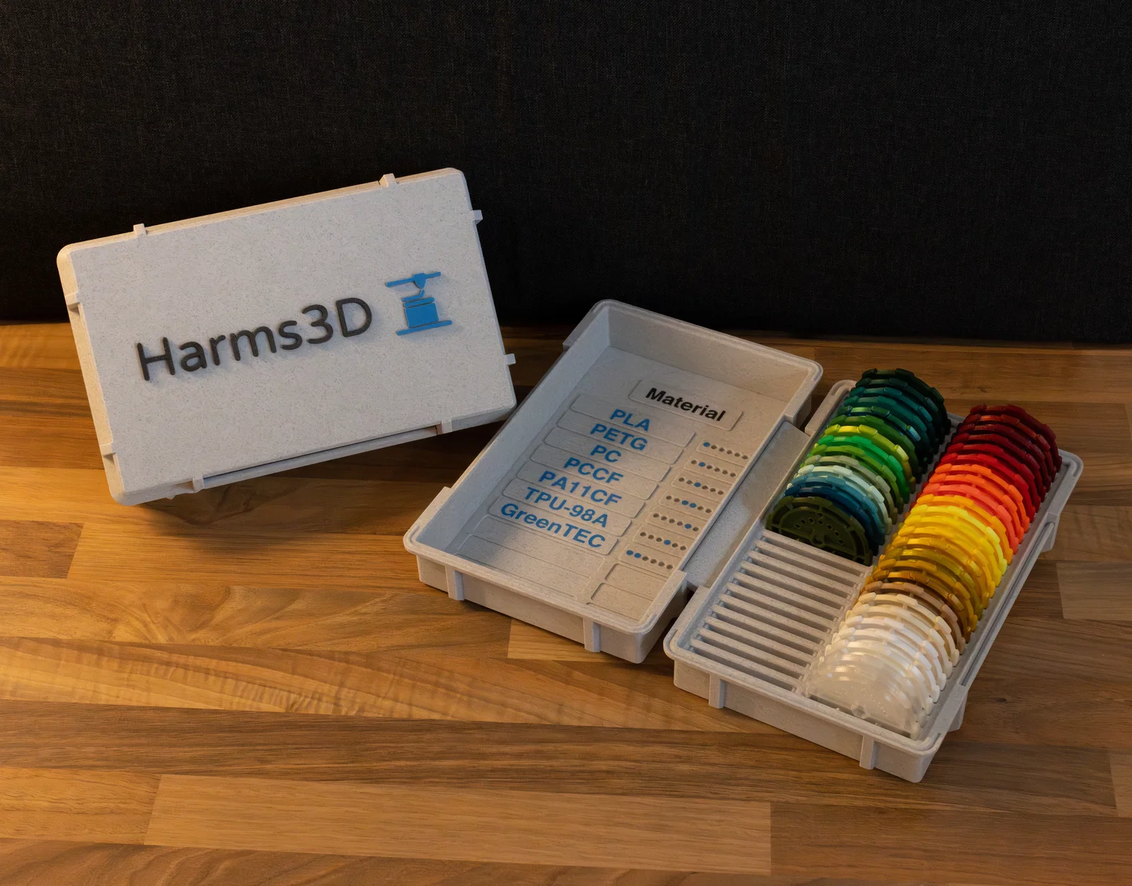 Bộ Filament Swatch Coins dạng đồng xu: dễ in, ít cong vênh, nhìn đẹp khi trưng bày. Có số 3 chữ số, mã lỗ nhận diện vật liệu (PLA, PETG…), test độ trong 1–8 lớp, xếp chồng được và có lỗ để xỏ dây.