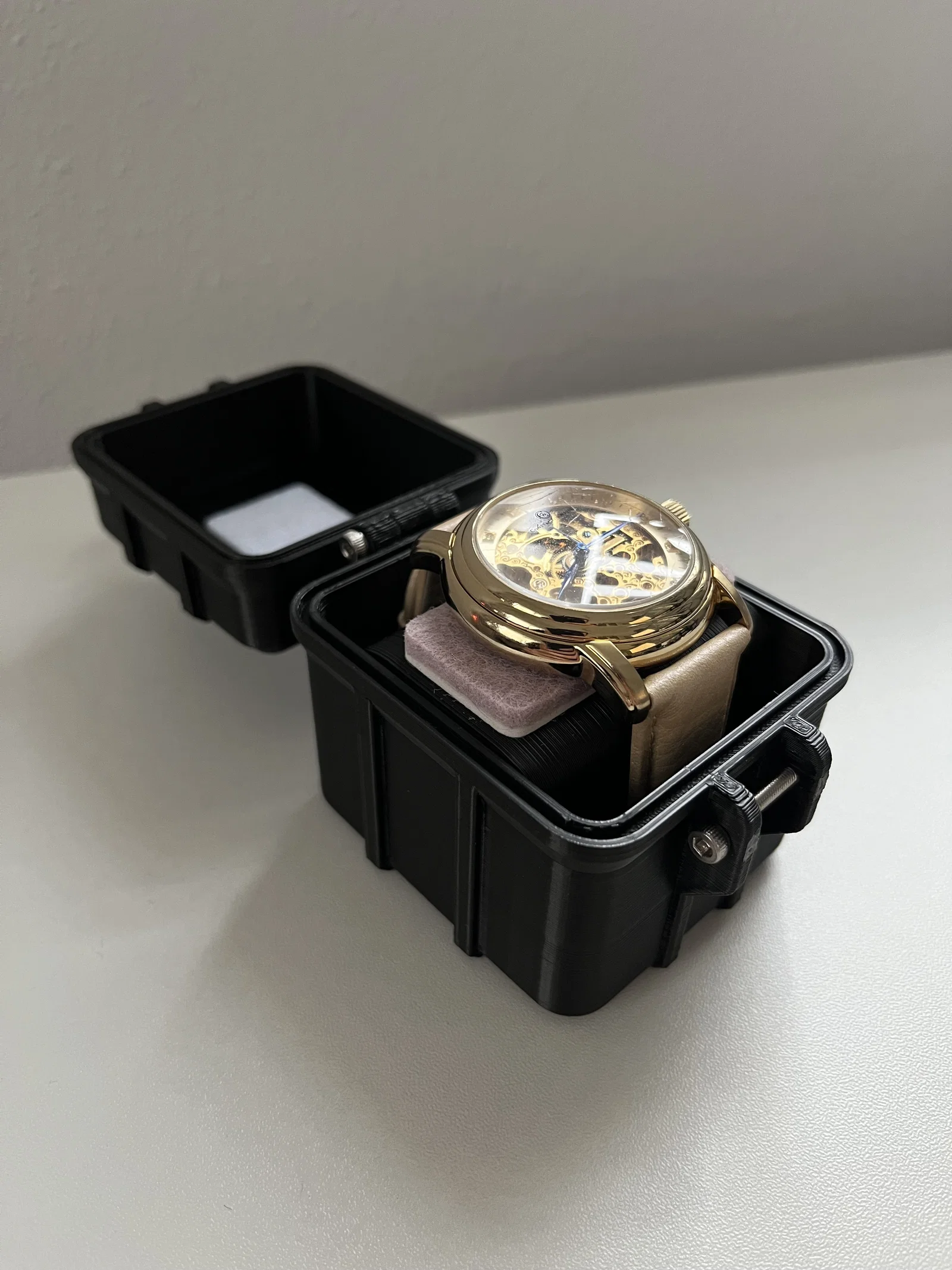 Một cái hộp để cất giữ đồng hồ của bạn an toàn. Bên trong có một phần giữ đồng hồ + một miếng đệm TPU cho nắp để tránh trầy xước (nếu bạn không in được TPU thì có thể dán nỉ vào). Đồng hồ không nên dày hơn 17mm để vừa trong case. Trong hình là phiên bản không dùng TPU. Mình dùng vài miếng đệm nỉ để tránh đồng hồ bị trầy.