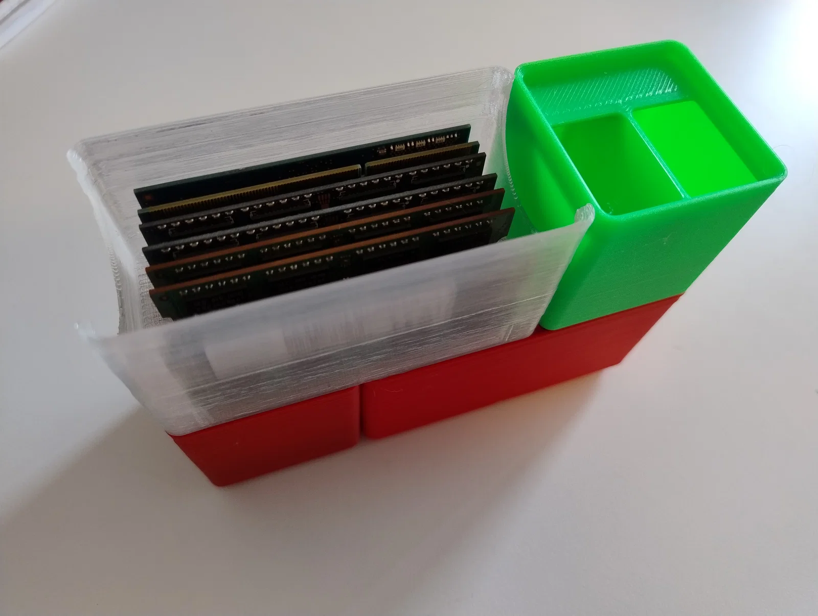 Một khay (bin) Gridfinity đơn giản dành cho module RAM SO-DIMM. Chứa được tối đa 8 thanh RAM trong một bin Gridfinity kích thước 2x1x6. Phần khoét hai bên giúp cầm/lấy các thanh dễ dàng hơn.