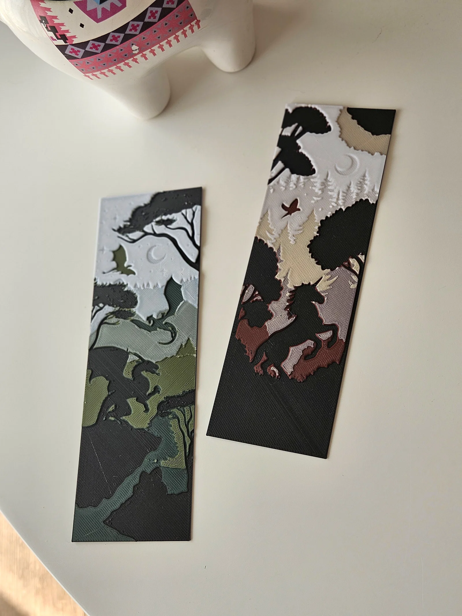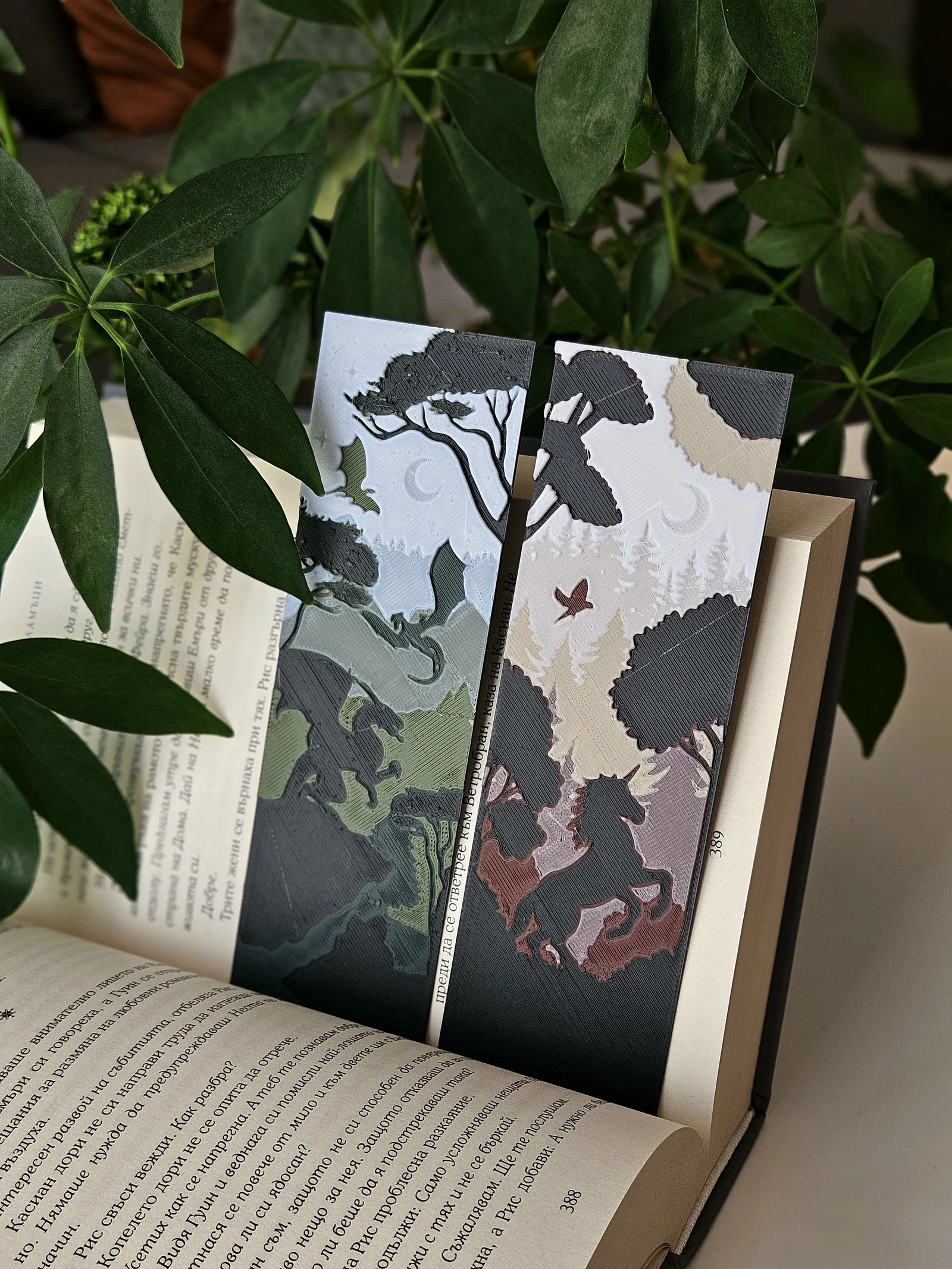 Cặp bookmark ấn tượng này có hình silhouette của một con rồng đang bay lượn qua khung cảnh sương mù và một con kỳ lân đứng uy nghi giữa rừng cây. Hai thiết kế mạnh mẽ này bổ sung hoàn hảo cho chủ đề phép thuật của cặp đầu tiên (gồm nàng tiên cá và nàng tiên). Gộp lại, bạn sẽ có trọn bộ 4 bookmark, mỗi chiếc tôn vinh một sinh vật huyền ảo khác nhau trong thế giới fantasy.