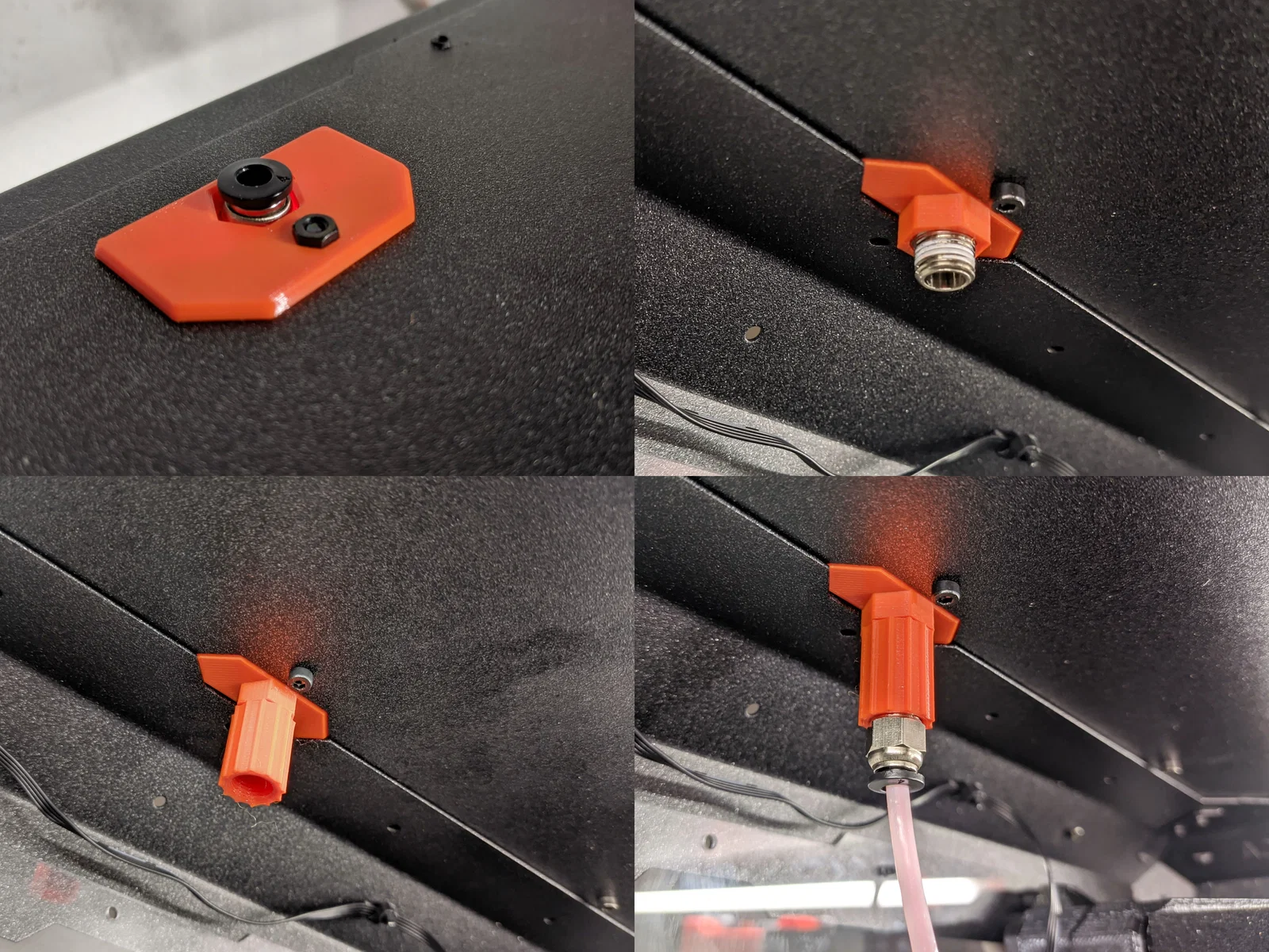 Trên Printables có rất nhiều giải pháp filament pass through, nhưng mình không thích kiểu nó thò ra ngoài enclosure quá nhiều, nên mình thiết kế 2 phiên bản khá là “flush” (sát mặt) này. Một cái dành cho phần mid cover, cái còn lại dành cho mép enclosure. Mỗi cái cần 2 đầu nối PC4-M10 để nối các ống PTFE từ hộp filament vào extruder.