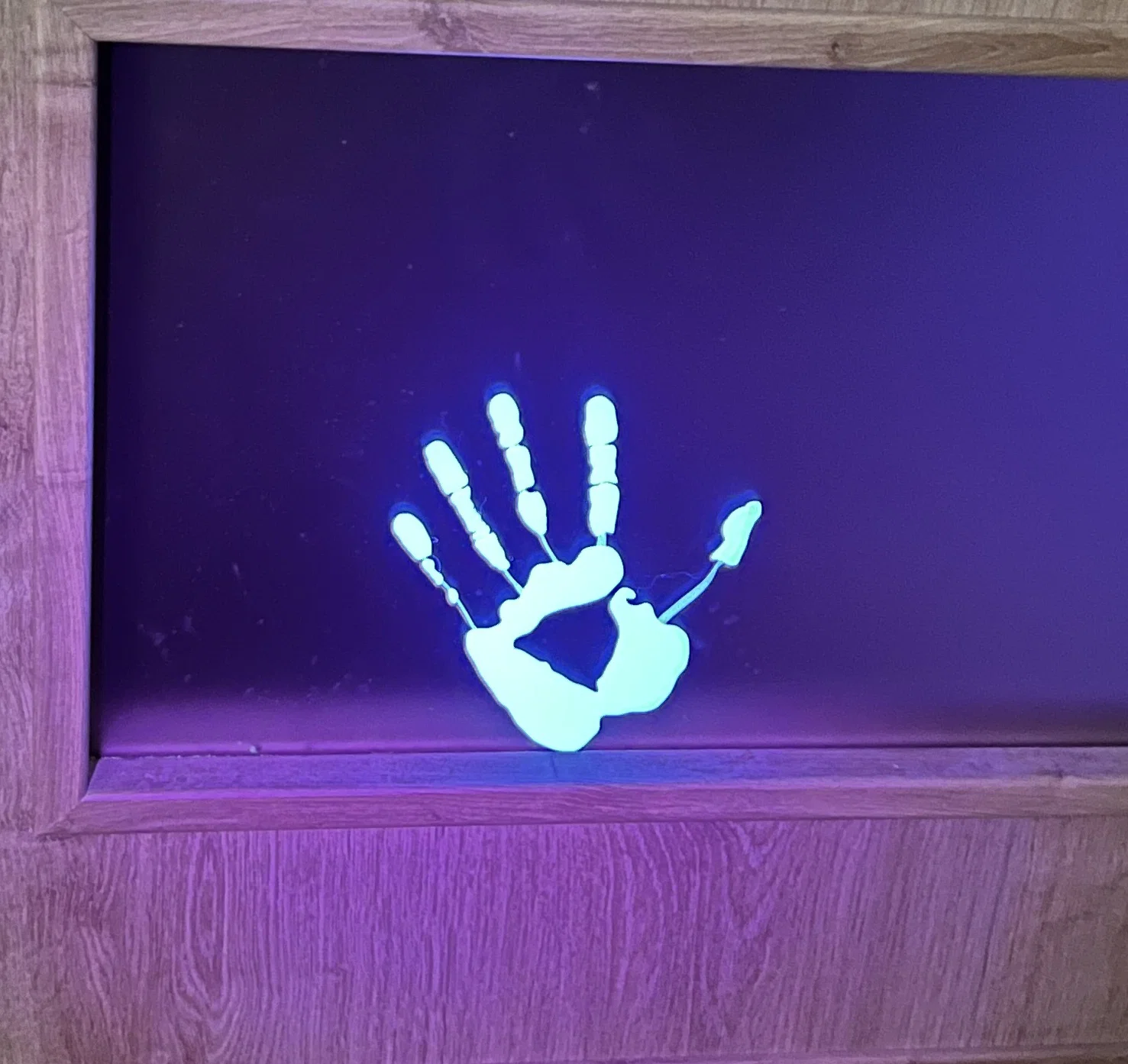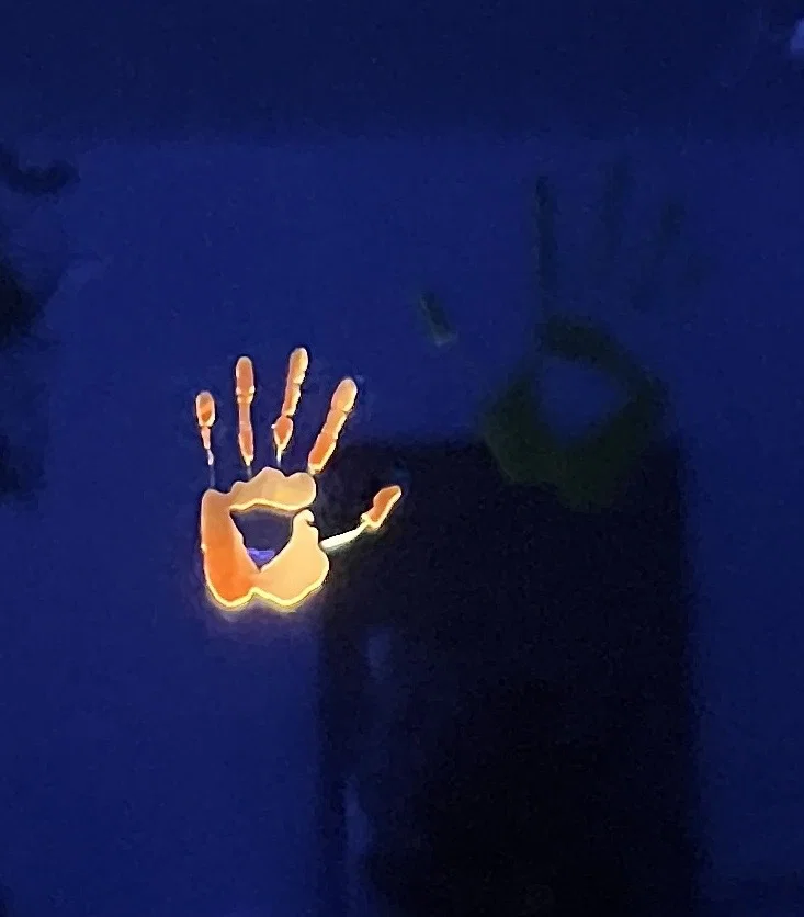 Dấu bàn tay ma Halloween dán lên cửa sổ, để bạn hù hàng xóm :) Kích thước gốc cỡ lòng bàn tay trẻ em; tăng 200% theo X,Y thì ra cỡ lòng bàn tay người lớn. Có 2 phiên bản: một mẫu đơn giản hơn, các ngón tay được nối liền; mẫu còn lại có viền rỗng (see-through).