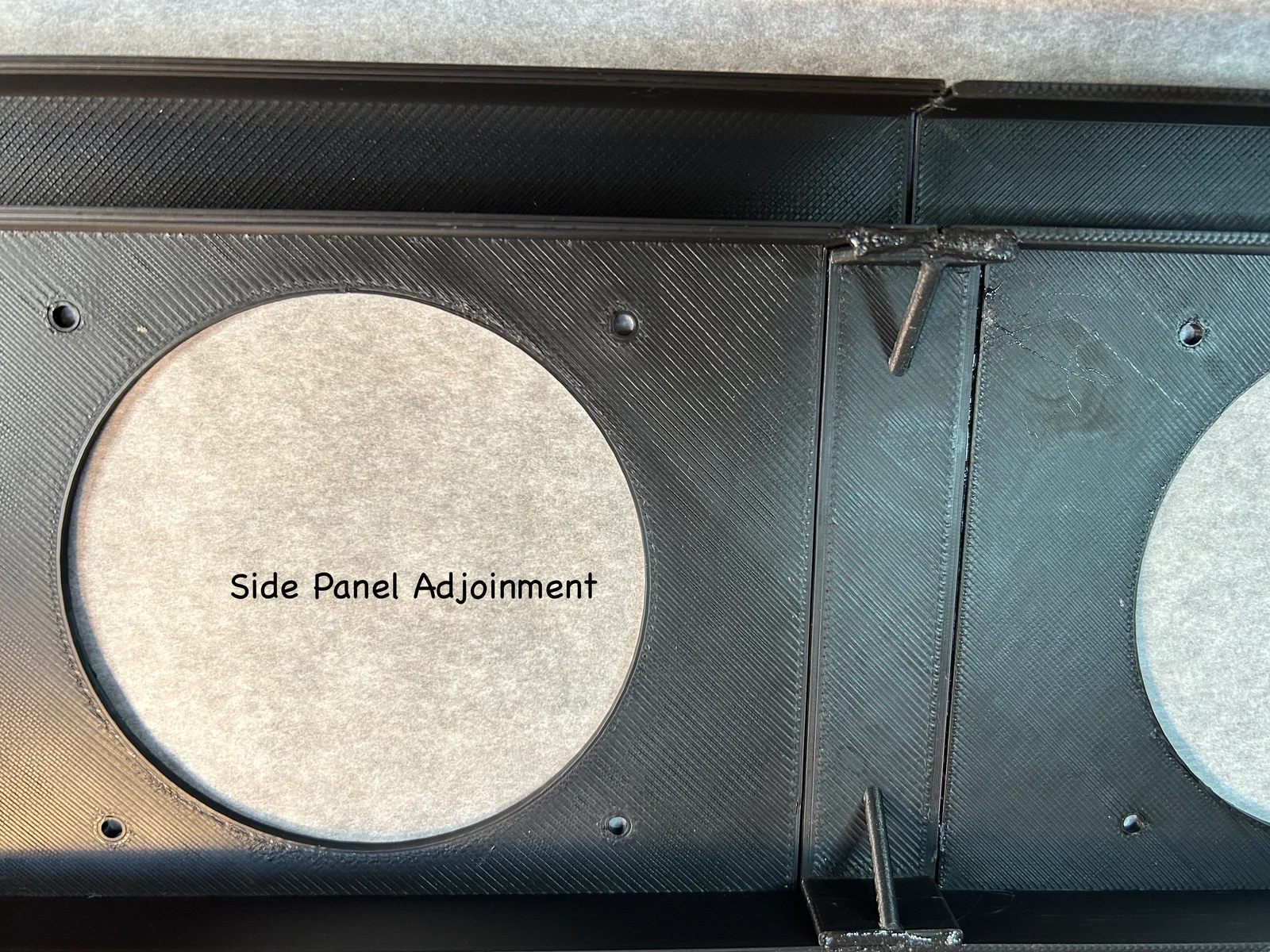 - Nối một phía của các panel (top, center, base), rồi nối phía còn lại bằng panel connectors và keo. Connector có thể khít. Có thể cần bù elephant foot và/hoặc cạo ba via (deburr) ở mép.