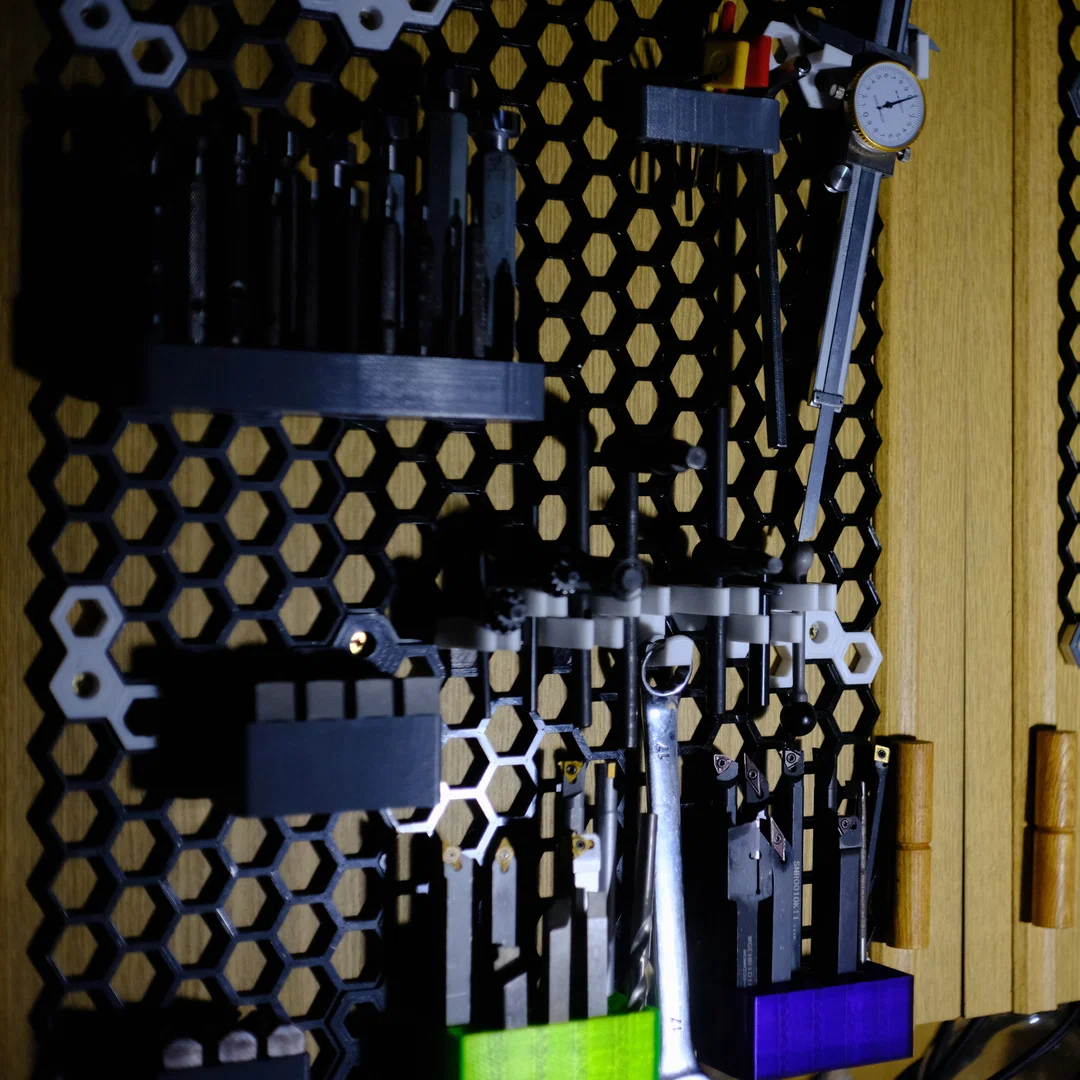 Generator OpenSCAD cho Honeycomb Storage Wall (HSW) để tạo holder/bin/tray/support theo tham số, kèm inserts hoặc plugs phía sau. Có STL ví dụ và file JSON lưu tham số; dùng BOSL2 và thư viện hex plug đi kèm.