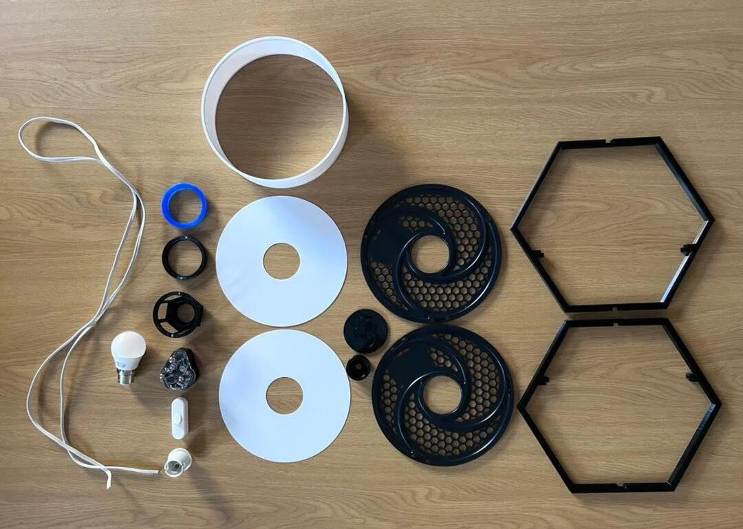Thiết kế đèn tái sử dụng filament spool rỗng, có script OpenSCAD để tùy chỉnh theo kích thước spool và đui đèn. Kèm spool/nắp trên nhiều hình (lục giác, tim, cây thông, sao) và PDF hướng dẫn in, lắp ráp.