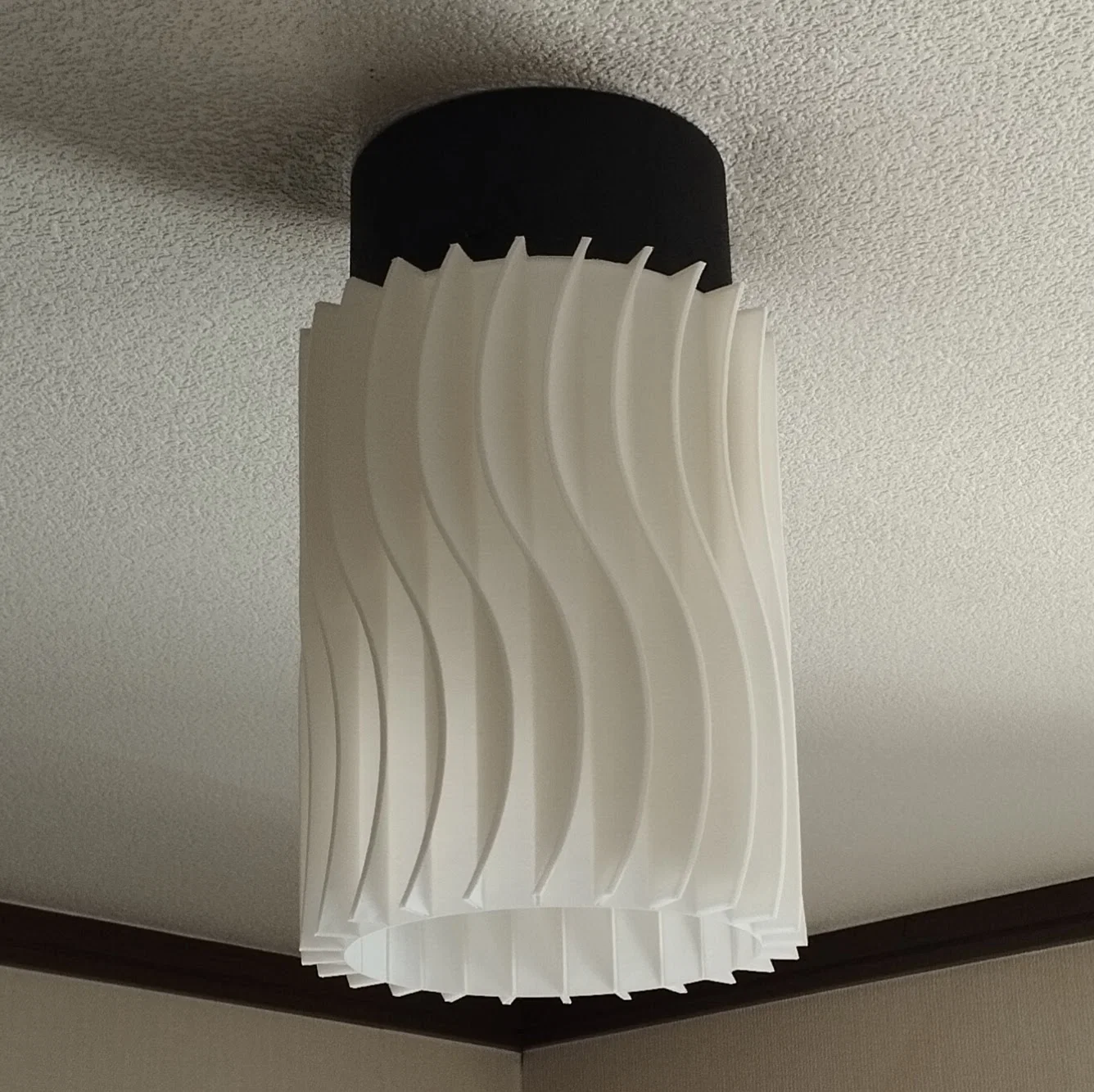 Wave Lamp là chụp đèn dạng trụ với một gợn sóng chạy quanh thân. Có thể dùng làm đèn thả trần, đèn ốp trần (kèm adaptor) hoặc đèn bàn (kèm đế). Khuyến nghị in vase mode để ánh sáng xuyên đẹp.