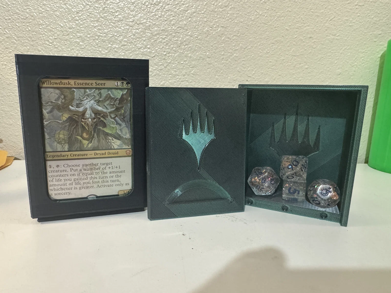 Hộp đựng MTG Commander dạng xếp chồng, có cửa sổ trưng lá Commander. Chứa deck 100 lá + side-deck 25 lá (có sleeves) và đế dice-tray để dice/counter/mini. V2 có lỗ nam châm 4×2mm, siết clearance; V1 & V2 không tương thích.