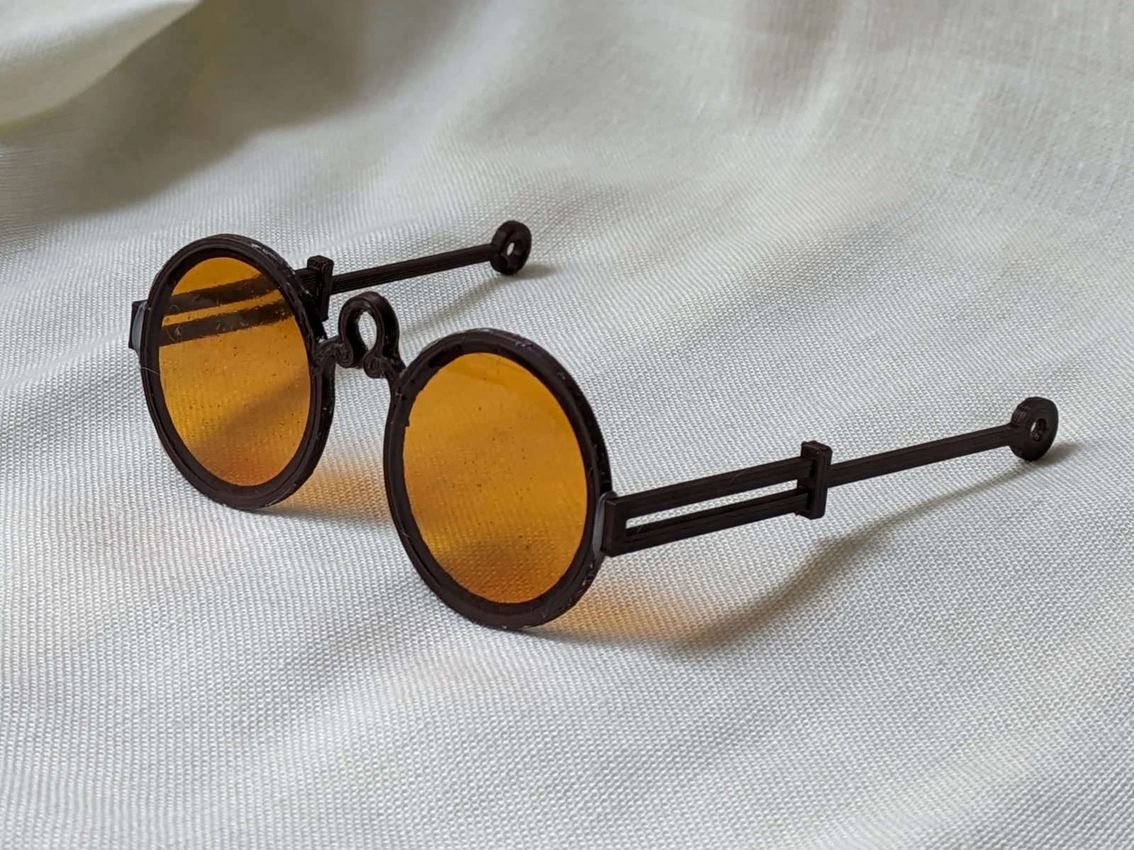 Mình in phần gọng với layer height 0.16. In xong thì mình phải chà nhám một chút để vừa khít hơn. Khi phần gọng đã ổn, mình tạm dán nó lên một miếng kính đã phủ băng keo trong (clear packing tape), rồi đổ tinted clear resin vào. Mình dùng thanh rod cỡ khoảng 1mm làm bản lề.