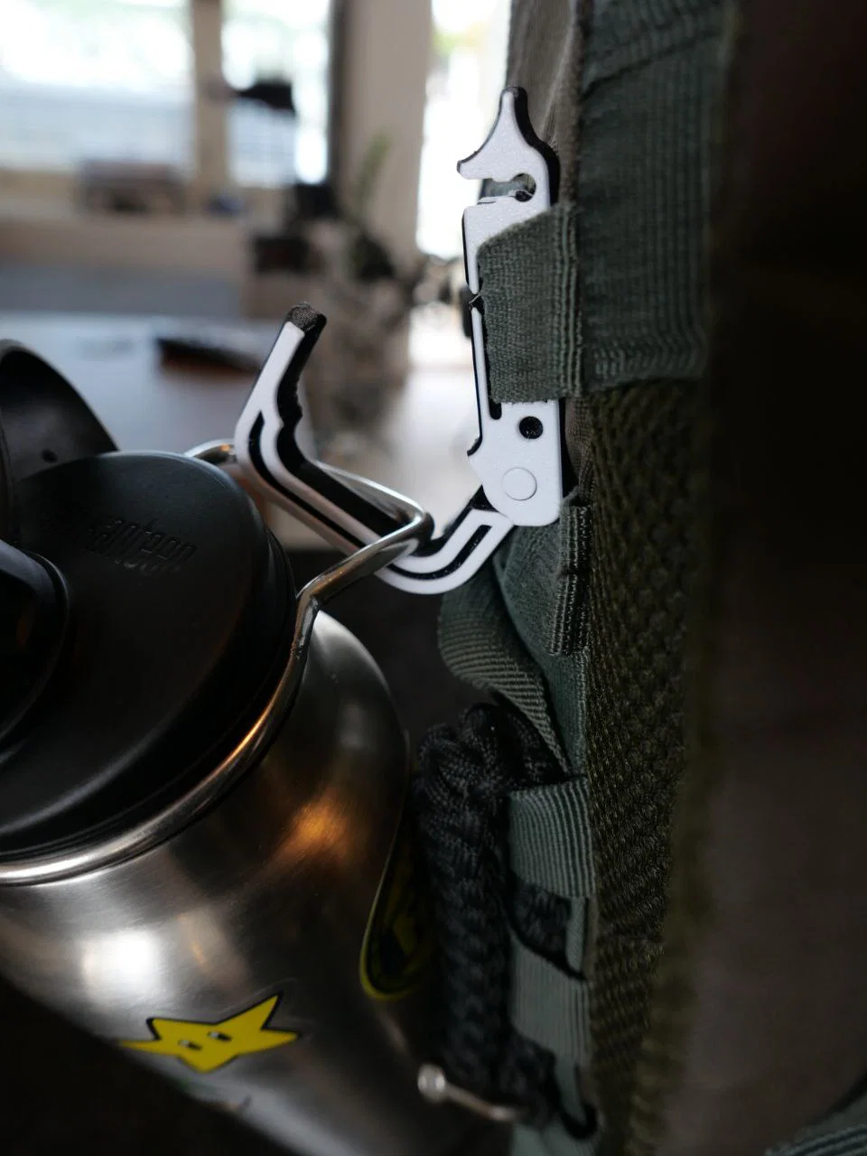 Một combo móc (hook) + carabiner kiểu D-ring cực kỳ đa dụng, lấy cảm hứng từ carabiner ITW GrimLoc mà mình đã dùng nhiều năm trên đồ gear và balo. Rất hợp để thao tác một tay, treo/mang theo những món hay dùng như găng tay, nón, bình nước, bó paracord… ở hông balo. Hoặc gần như ở bất cứ đâu có dây MOLLE/PALS webbing hay strap bản 25mm để gắn.