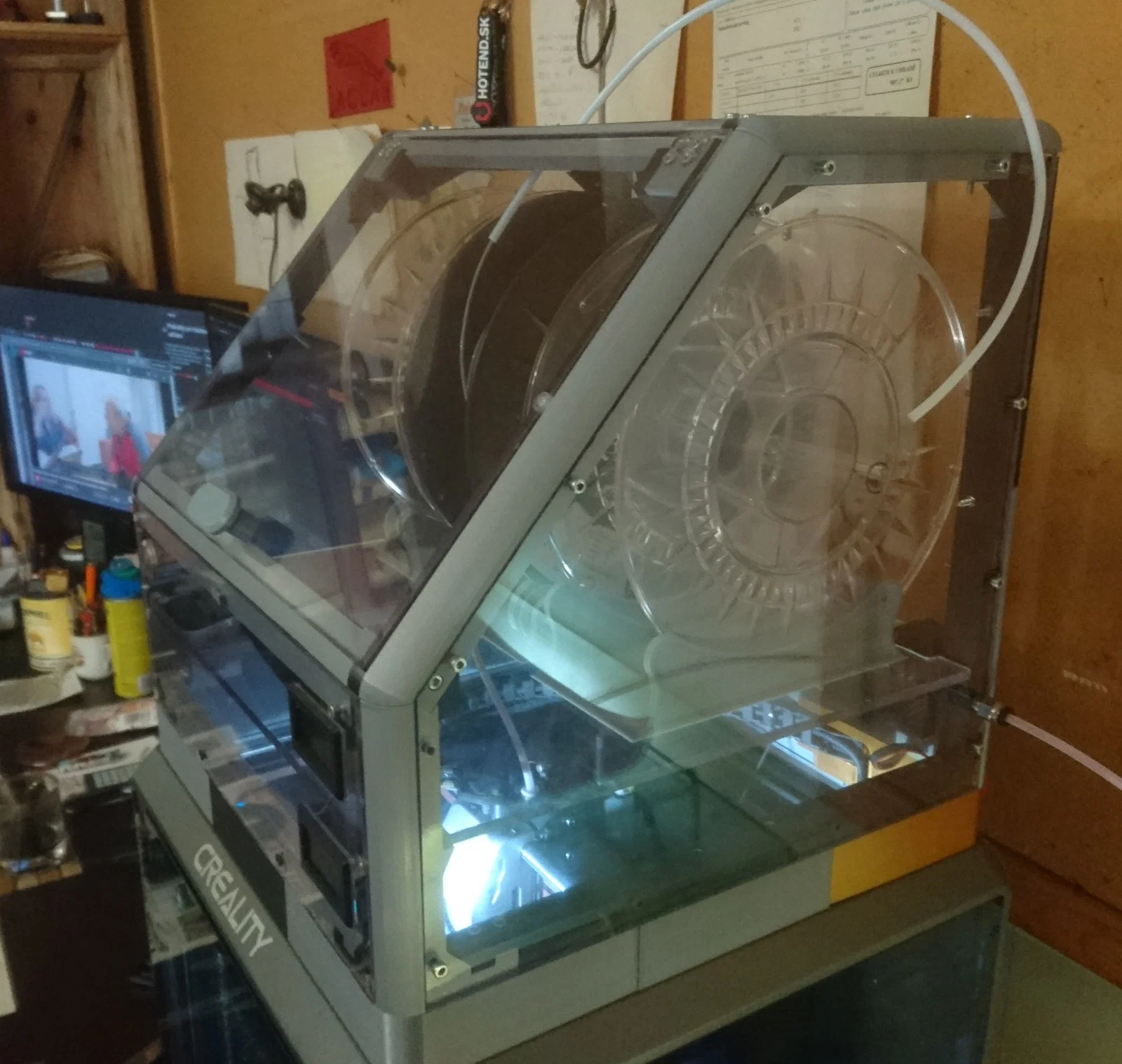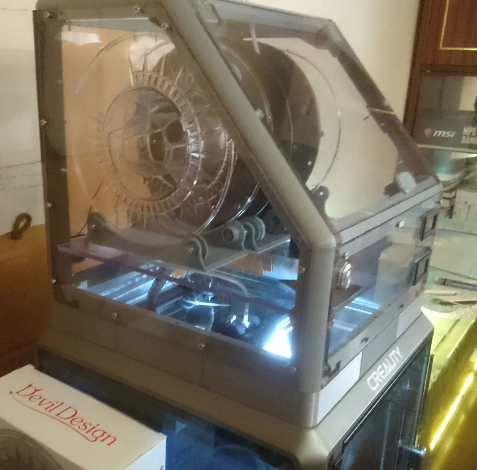 Bộ attachment cho Creality K1/K1C, phiên bản V4: khung dùng ốc M3, file xuất 1 assembly = 1 *.stl vừa khay in. Khoang trên chứa 3 cuộn filament 1Kg, có tùy chọn lắp PTFE, Plexiglas 3–5 mm.