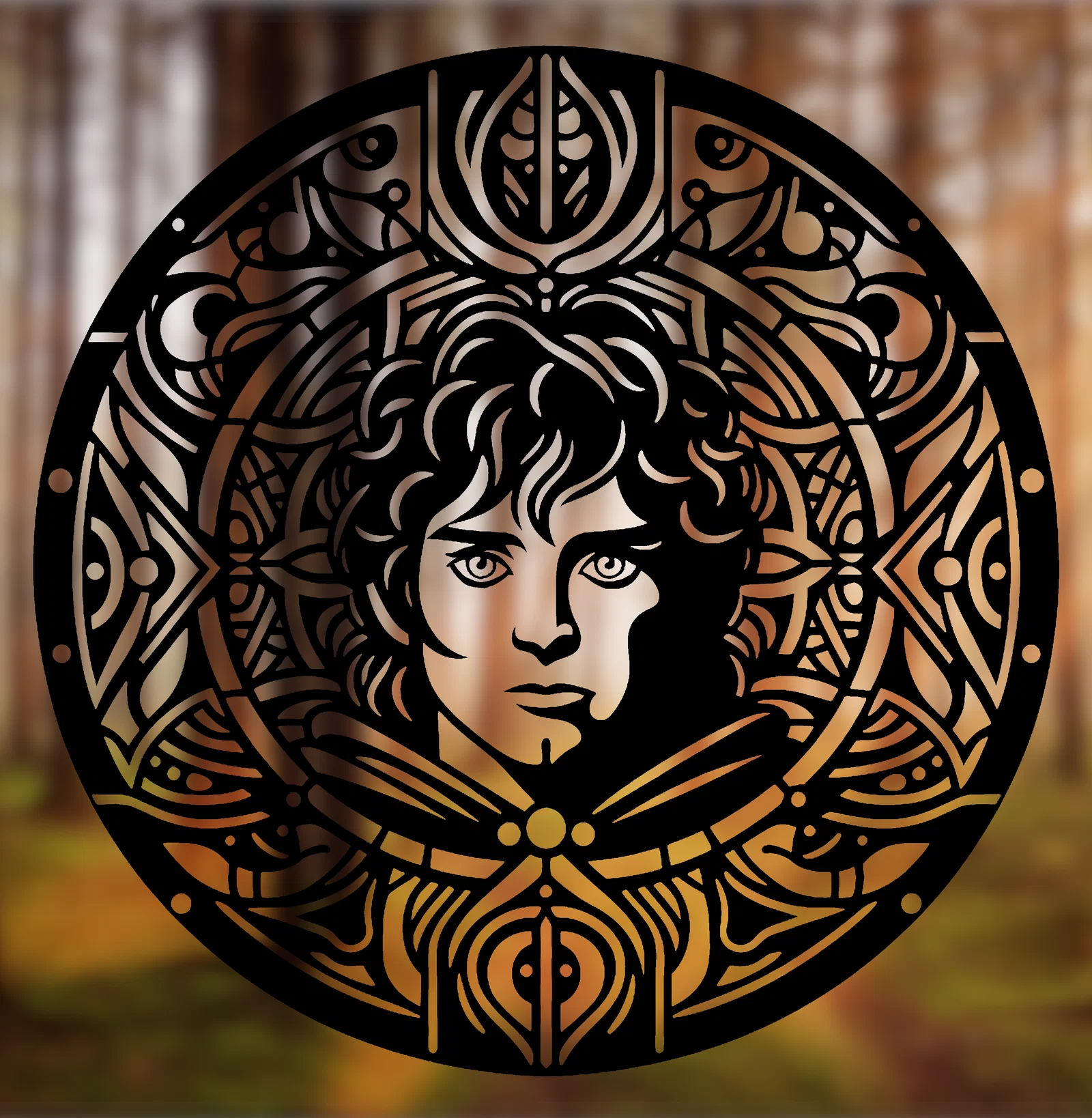 Silhouette 2D Frodo Baggins với họa tiết mandala tinh xảo, chuẩn phong cách stained glass để làm wall art/trang trí nhà. Gợi ý in bằng filament trong mờ hoặc resin để hiệu ứng kính màu nổi bật, rất hợp làm quà cho fan fantasy.