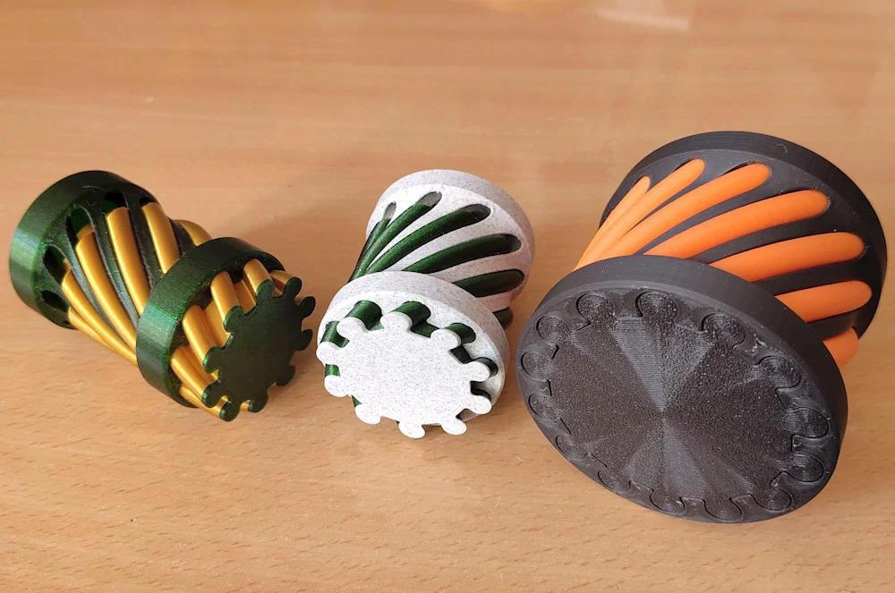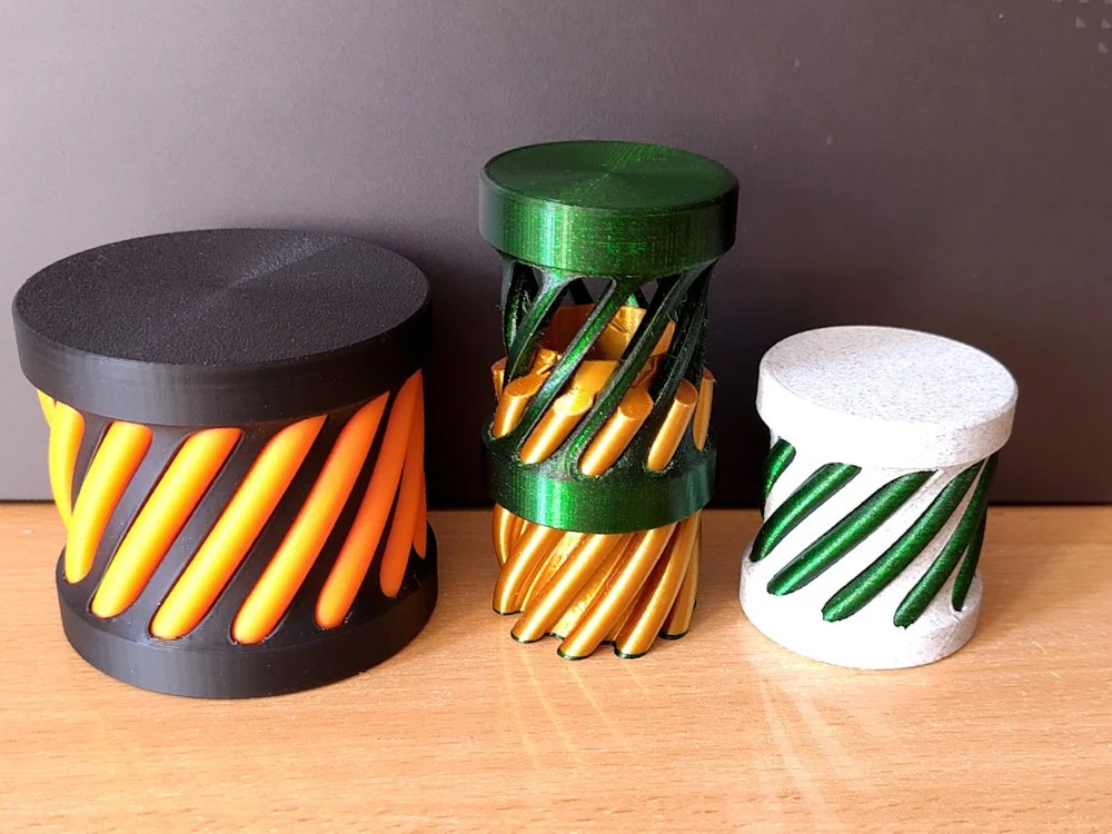 In 1 part một màu và part còn lại màu khác; PLA là ổn, mình dùng nozzle 0.4mm, không cần supports. Mình khuyên dùng layer height khác nhau cho phần trong và phần ngoài để lúc trượt ra/vào đỡ bị cạ xước.