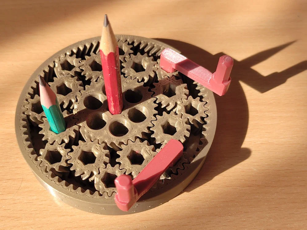 To hơn! Nhiều hành tinh hơn! Quay nhanh hơn! Thậm chí còn hack não hơn! Chắc hẳn mọi người đã từng chơi qua mấy bộ bánh răng hành tinh rồi, mấy món đó rất hay, đặc biệt là loại herringbone in liền khối (print-in-place). Tuy nhiên, mẫu “Bánh răng nghịch lý” (Counterintuitive Gear) này sở hữu hai hàng hành tinh, dẫn đến những cơ chế hoạt động cực kỳ bất ngờ: | | Bánh răng hành tinh bình thường | Bánh răng nghịch lý | |---|---|---| | Khi giữ vòng ngoài và xoay bánh răng mặt trời | Các hành tinh xoay cùng chiều | Các hành tinh xoay ngược chiều | | Khi giữ đứng bánh răng mặt trời và xoay vòng ngoài | Các hành tinh xoay cùng chiều nhưng chậm hơn vòng ngoài | Các hành tinh xoay cùng chiều nhưng nhanh hơn vòng ngoài | Với phiên bản MkII có bánh răng mặt trời lớn hơn, các hành tinh quay nhanh hơn nữa, gần như đạt 2 vòng quay cho mỗi một vòng quay của vành ngoài. Các lỗ lục giác này vừa với bút chì lục giác thông thường hoặc (mình khuyên nên dùng nhiều hơn một cái). Phiên bản MkI (bánh răng mặt trời nhỏ hơn) có thể tìm thấy tại . Lưu ý khi in: Dùng đầu phun 0.4mm, thiết lập vị trí đường nối (seam) ngẫu nhiên, các thông số còn lại giữ như tiêu chuẩn. Mình cũng đã sử dụng chế độ infill archimedean chords cho lớp trên và dưới. Đây là mô hình in liền khối (print-in-place), không cần lắp ráp gì cả, nhưng cần máy in của mọi người đã được cân chỉnh chuẩn xác nhé.