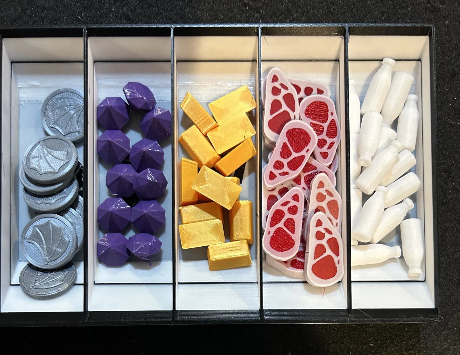 Bộ tài nguyên deluxe (thịt, sữa, gem, vàng) để thay token bìa cứng trong Wyrmspan. Bản remix làm token sữa thành một mảnh liền cho dễ in. In chủ yếu bằng PLA thường; thỏi vàng dùng silk PLA.