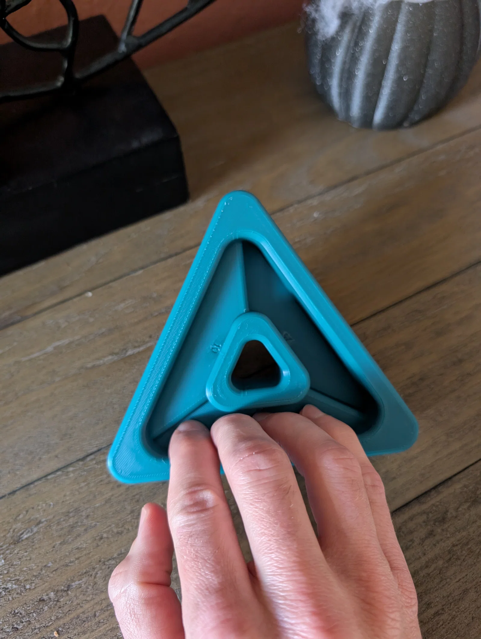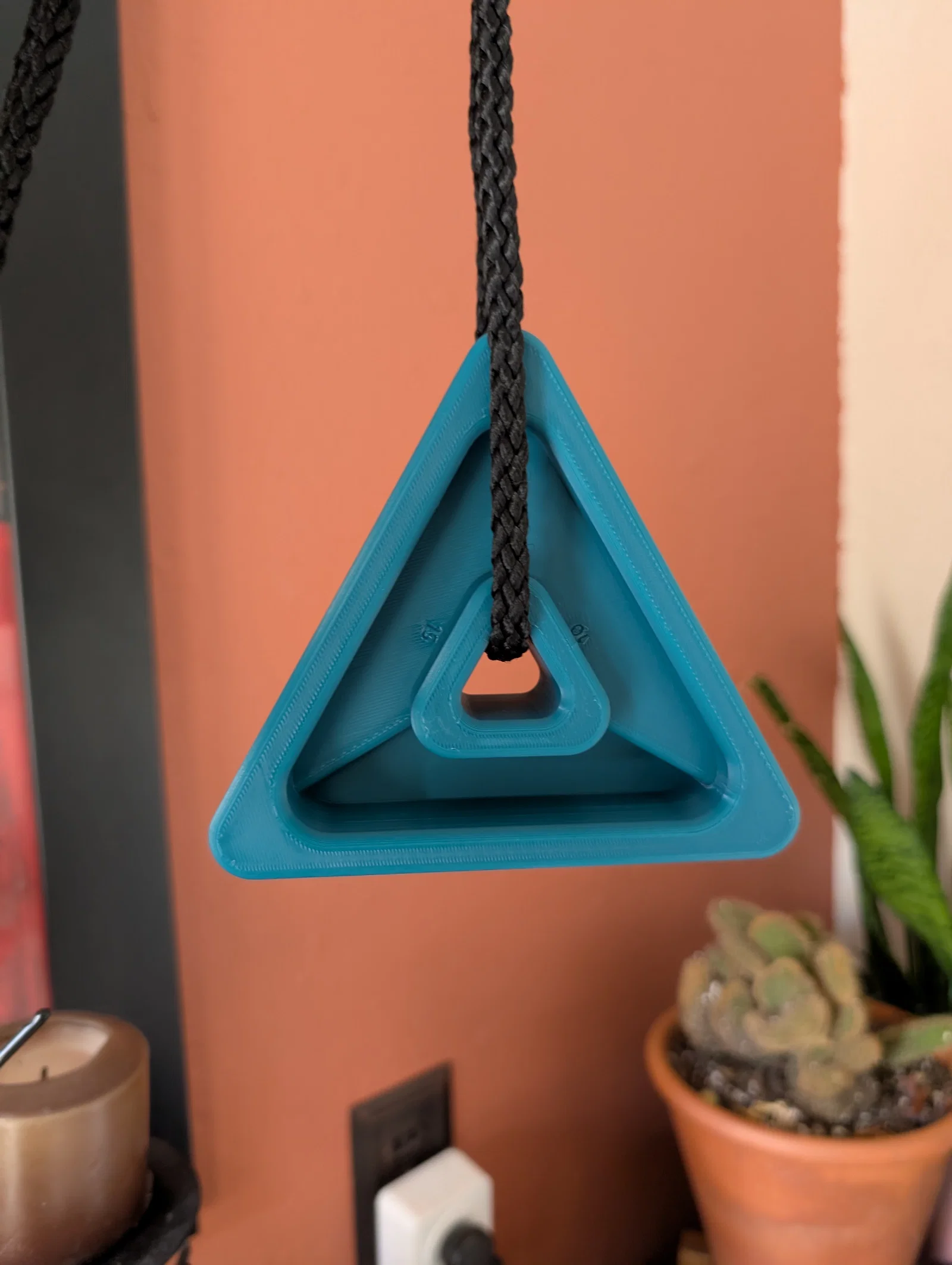 Tay nắm treo dạng tam giác để tập grip leo núi/bouldering, kiểu giống fingerboard. Có 3 mức độ sâu 25mm, 15mm, 10mm (có đánh dấu). In PLA cần in chắc và dùng cẩn thận.