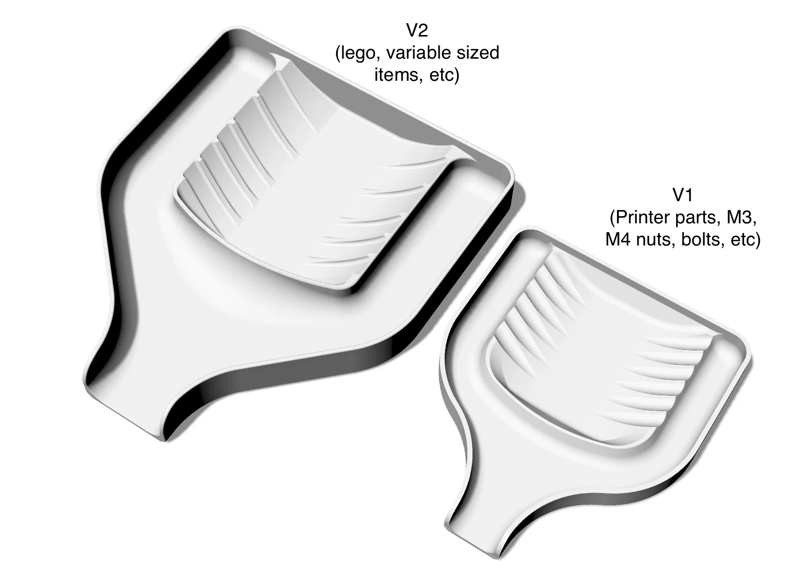 Multi-Sort V2 là khay sorting cho vật dụng kích thước đa dạng như Lego. Có máng bên lớn hơn, rãnh dẫn hướng nhiều cỡ (rãnh nhỏ gần phía trước), và cải tiến QOL với vách trung tâm cao, góc dốc hơn để hạn chế đồ trơn rơi lọt.
