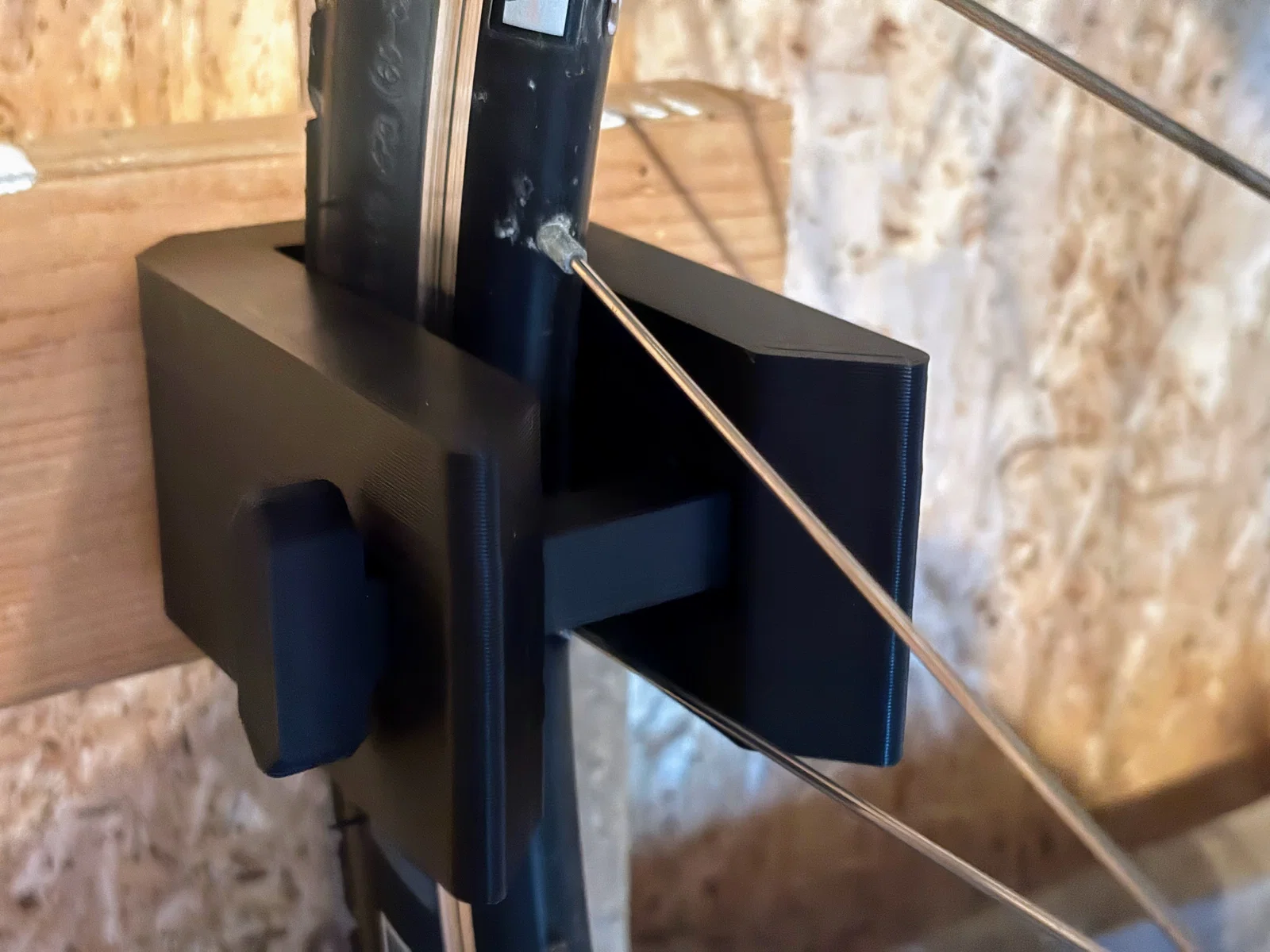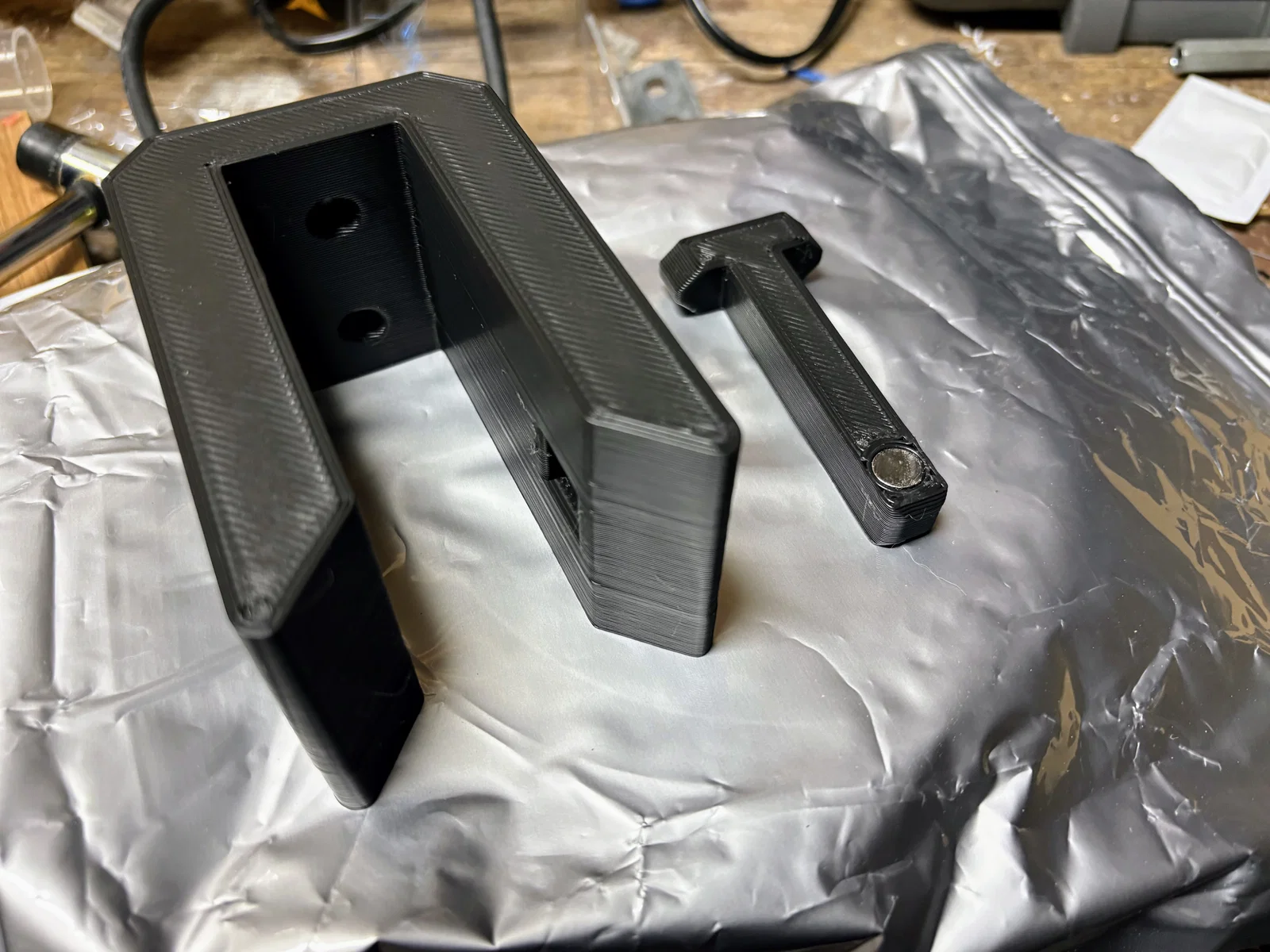 Nên mình làm ra thiết kế đơn giản này: giữ xe bằng kiểu friction fit và khóa lại bằng một chốt khóa, chốt này được giữ cố định nhờ 3 viên nam châm tròn 10 x 3 mm. Dù lốp có xì hơi theo thời gian thì xe vẫn treo chắc.