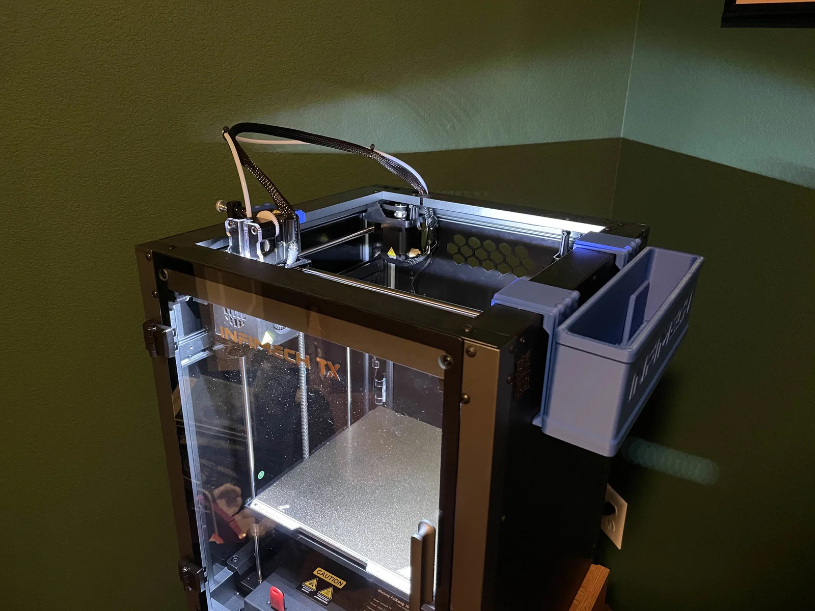Hộp lưu trữ treo tiện lợi cho Infimech TX, giúp để dụng cụ hoặc đồ hay dùng ngay cạnh máy in 3D. Gồm 2 file model: phần bin và phần hooks, có thể in chung trên một build plate.