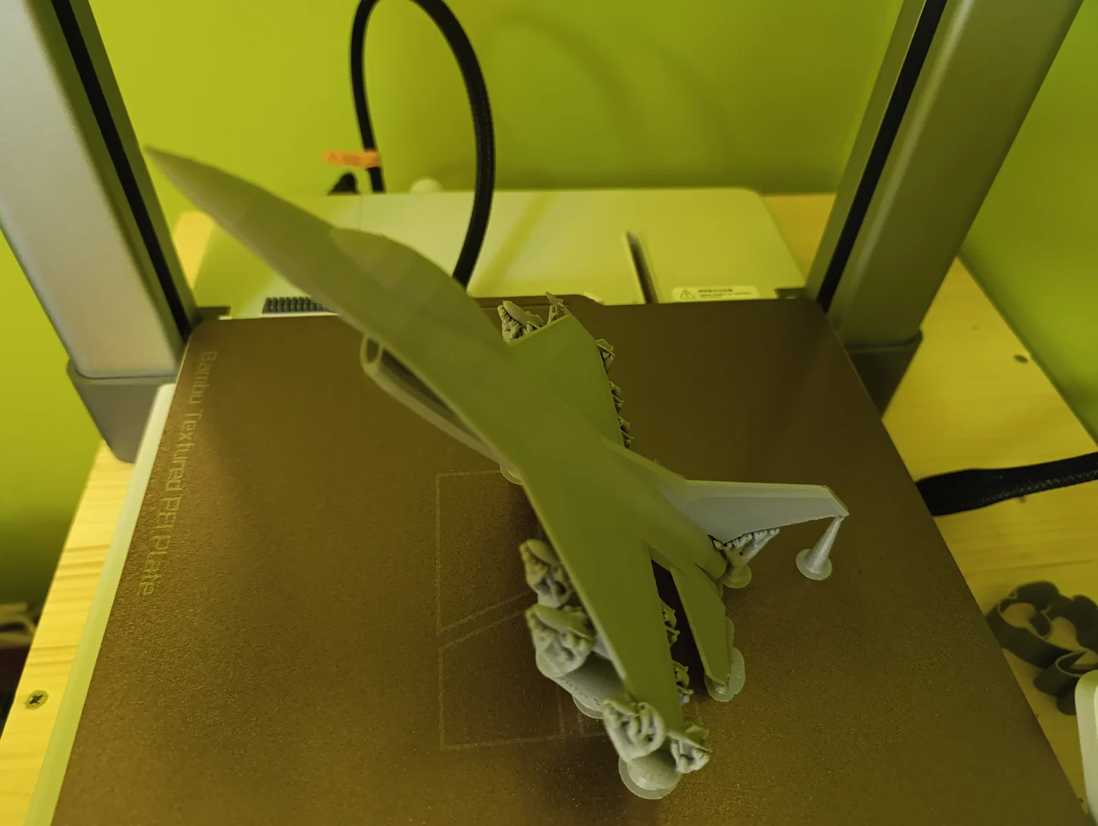 - Thiết lập hỗ trợ (Supports): Do mô hình có nhiều chi tiết nhỏ như tên lửa dưới cánh, việc sử dụng support là bắt buộc. Bạn hãy chú ý chọn kiểu "tree support" hoặc các thiết lập hỗ trợ dễ tháo rời để tránh làm hỏng bề mặt mô hình khi hậu xử lý.