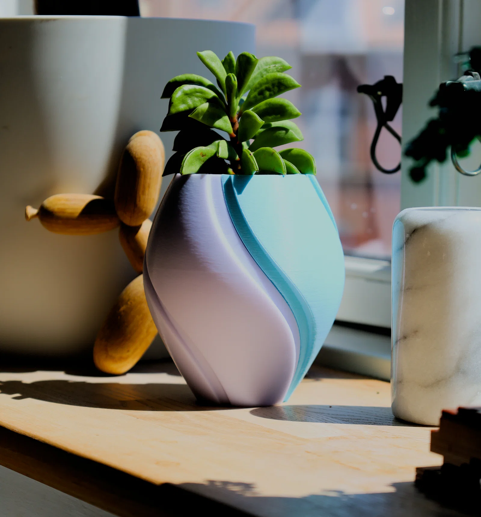 Mẫu Pot 6 là chậu cong hai màu cho cây succulent/sen đá, thiết kế cho chậu lót đường kính 6 cm và sâu 6 cm. Lắp bằng 2 phần “pot 6” và 2 khớp nối; lưu ý không dùng fuzzy skin để ráp vừa.