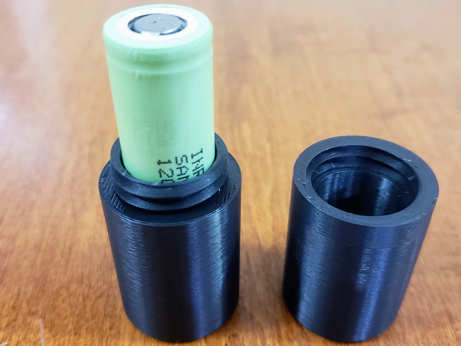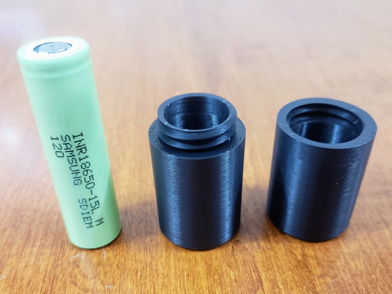 Case đựng pin 18650 dạng 2 nửa vặn ren, giúp che kín và hạn chế nguy cơ chập mạch khi cất trong túi/hộp. Thiết kế chừa khoảng hở ~1mm quanh pin, dễ in với PLA (variable layer height).